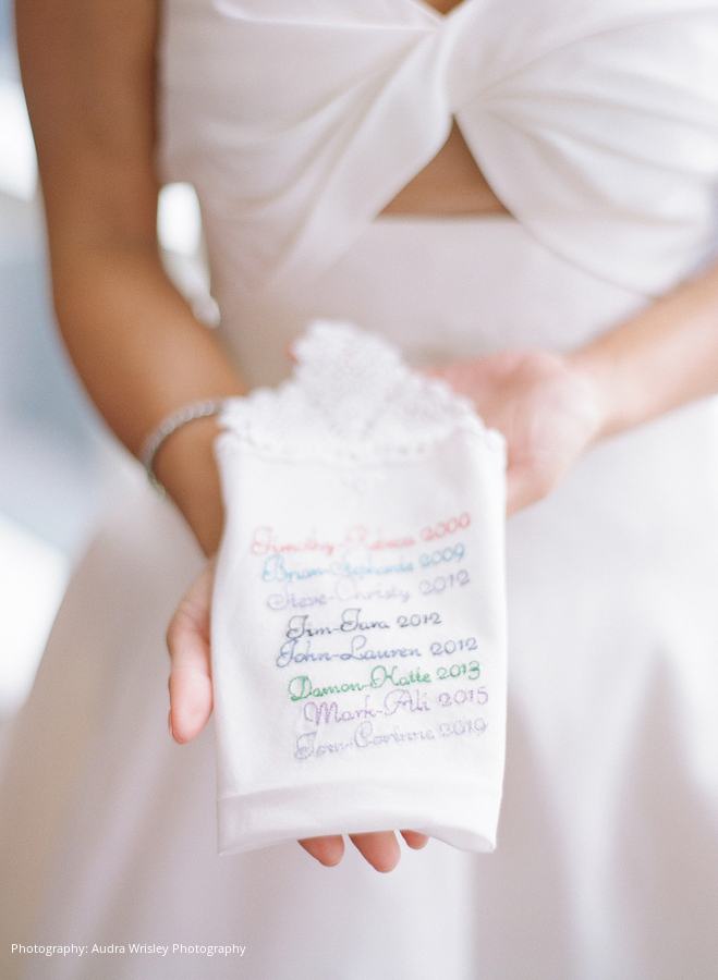 When the wedding day arrived, the bride and groom were married in front of 240 guests at Christ Lutheran Church in Baltimore, Maryland and hosted their reception at the Four Seasons in Harbor East. Corinne wore an elegant Oscar de la Renta ballgown with a custom bow, and Tom sported a classic Ted Baker tuxedo. For her “something blue,” Corinne also carried a handkerchief passed down to all the brides on Tom’s side of the family, with all their names embroidered on it in pale blue.