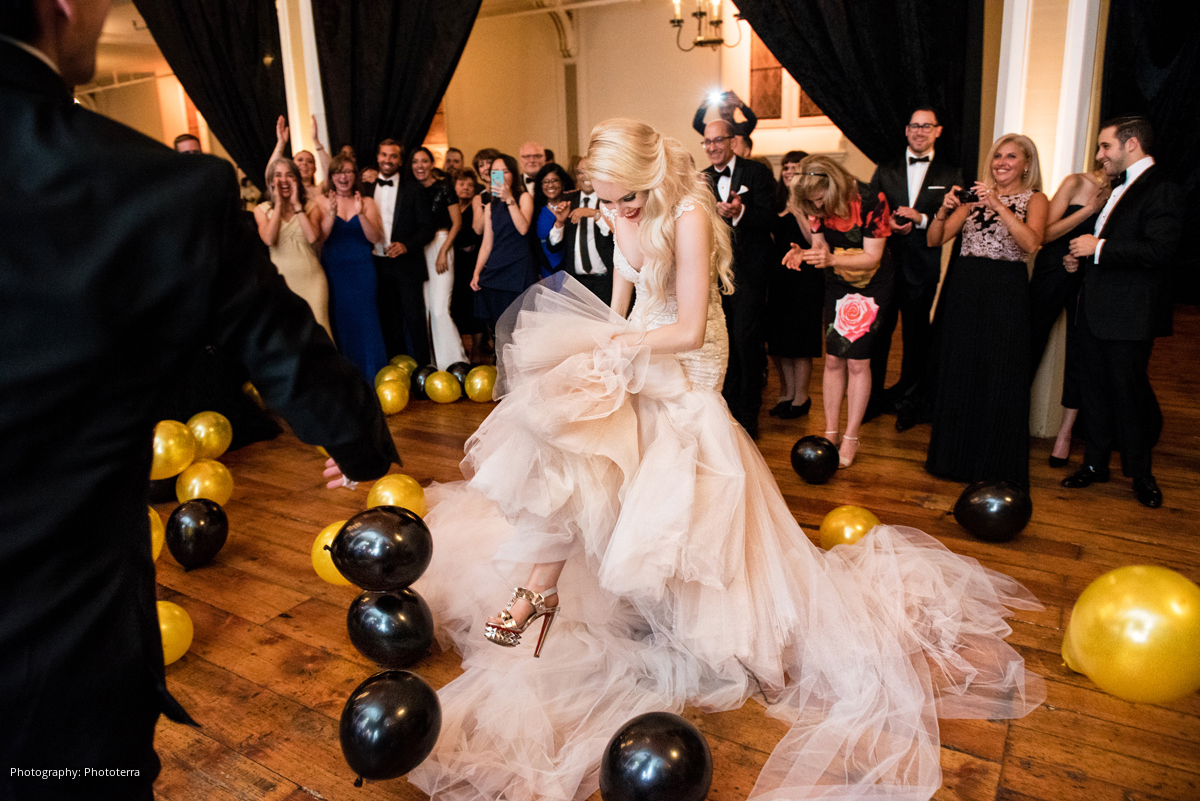 Right away, the couple dove into the wedding planning process, envisioning a Great Gatsby-themed celebration that would be a fun, over-the-top, and full of surprises. When the big day arrived, the wedding venue was draped in black and gold with ostrich feathers and flowers adding a dramatic touch.