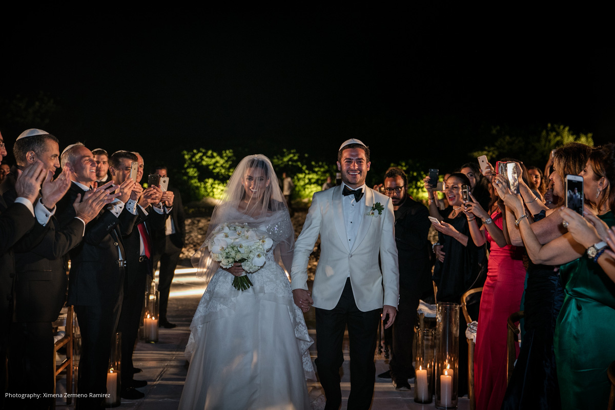 When the big day arrived, the bride and groom’s wedding ceremony took place under the stars and a full moon with the sound of waves crashing in the background. Floor sparklers went off when they shared their first kiss as husband and wife, and Gabriel surprised Jasmin by arranging a firework display that lit up the entire sky.