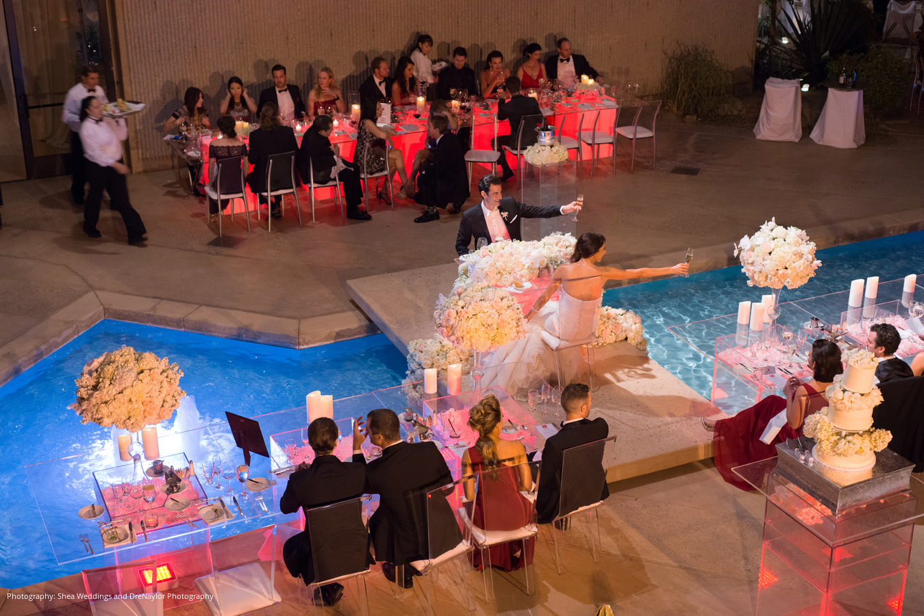 Ceremony Location: Palm Springs Art Museum, Palm Springs, CA; Reception Location: Twin Palms, Sinatra House, Palm Springs, CA; Event Design and Planner: Sensorium Event Productions, Palm Springs, CA; Floral Design: LeeLina Martin, Long Beach, CA; Wedding Dress and Veil: Vera Wang