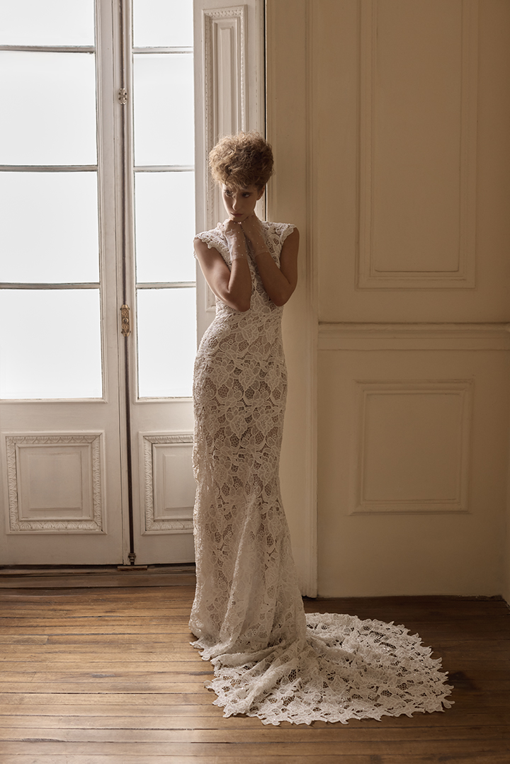 Handcrafted in the Barranquilla atelier, Retratos continues the house’s commitment to artisanal excellence, where texture becomes a language of emotion. Intricate guipure and Chantilly laces are reimagined with sculptural precision, forming gowns that contour the body with both delicacy and structure. A fitted silhouette in openwork lace reveals subtle transparency, its cap sleeves and high neckline framing a dramatic open back—an interplay of restraint and allure. Elsewhere, a long-sleeved lace gown evokes timeless romanticism, its fluid train dissolving into softness and light.