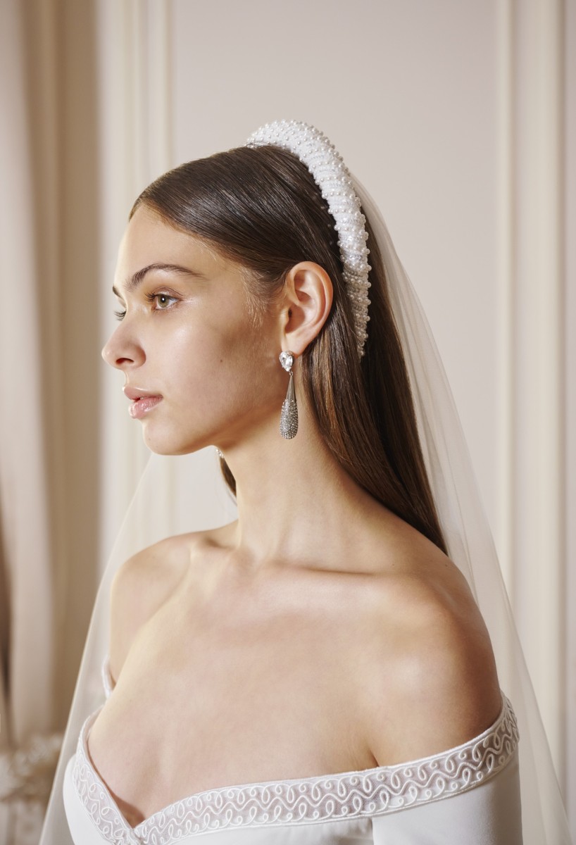 Numerous accessories—metallic earrings decorated with crystals, headdresses with 3D crystallized flowers, and crystallized headbands—embellish the collection, which also features wedding suits enriched with delicate embroidery details made from exceptional wools in a palette of subtle colors, ranging from white to pearl gray and beige.