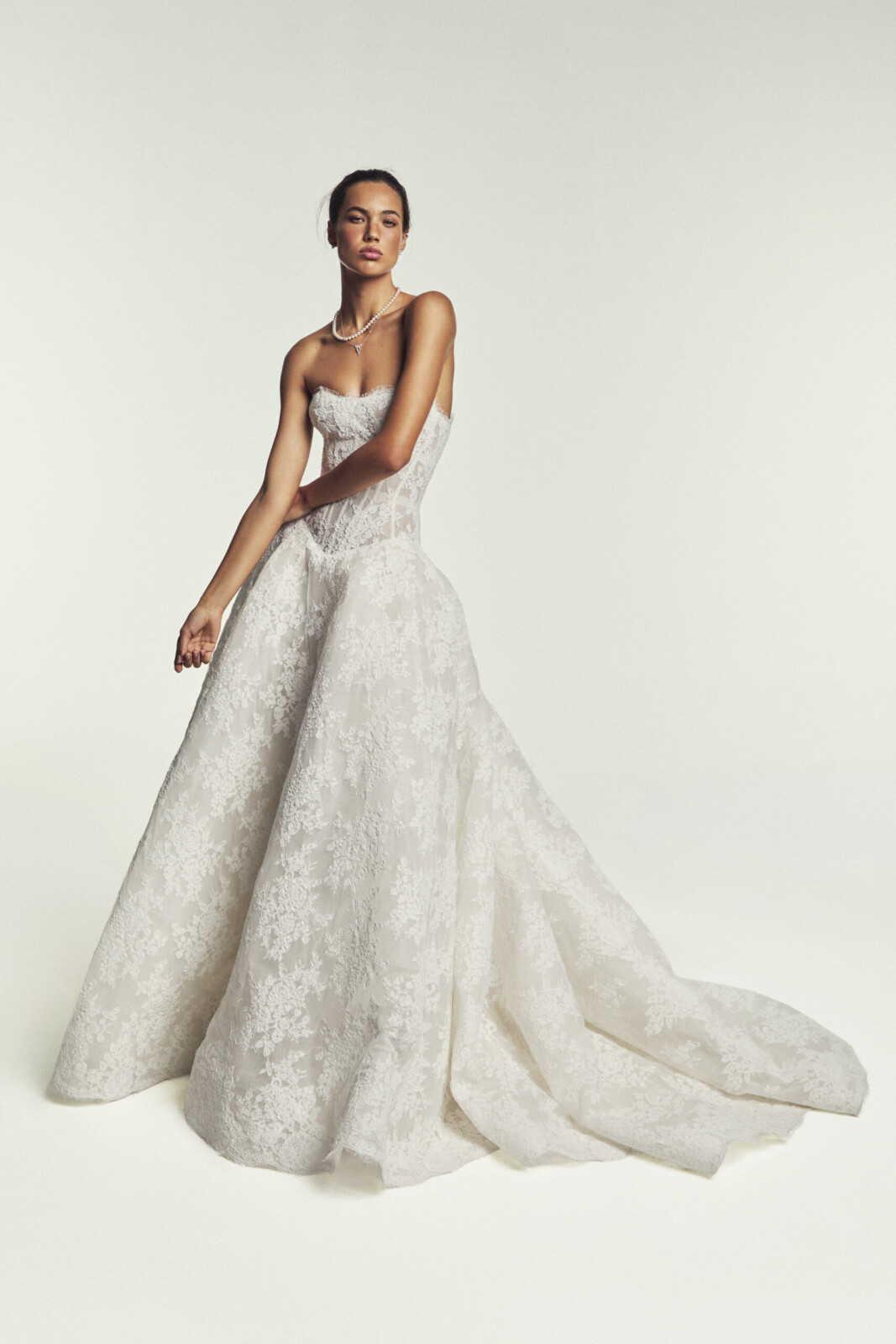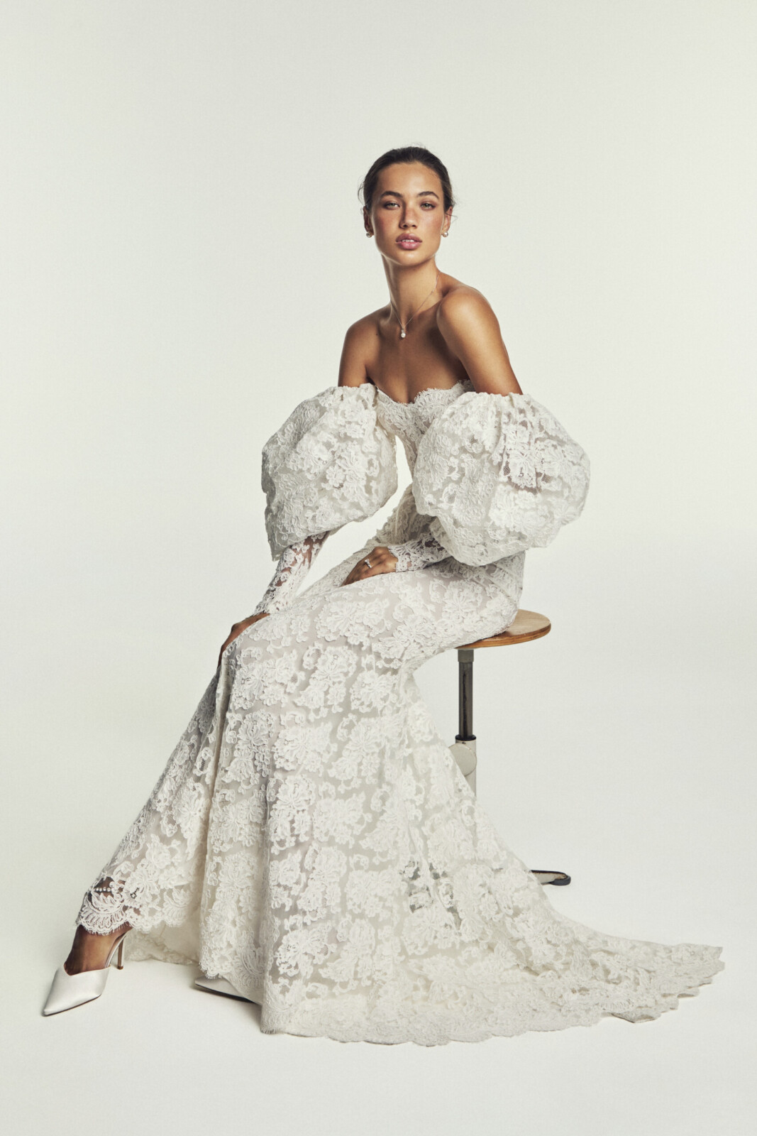 Lace takes center stage in an effortless, modern expression. Sculpted separates emerge as defining elements — from drop-waist corsetry with precise boning to weightless, sheer layers. Jackets, voluminous overskirts, and detachable sleeves introduce versatility, allowing each look to evolve throughout the celebration.