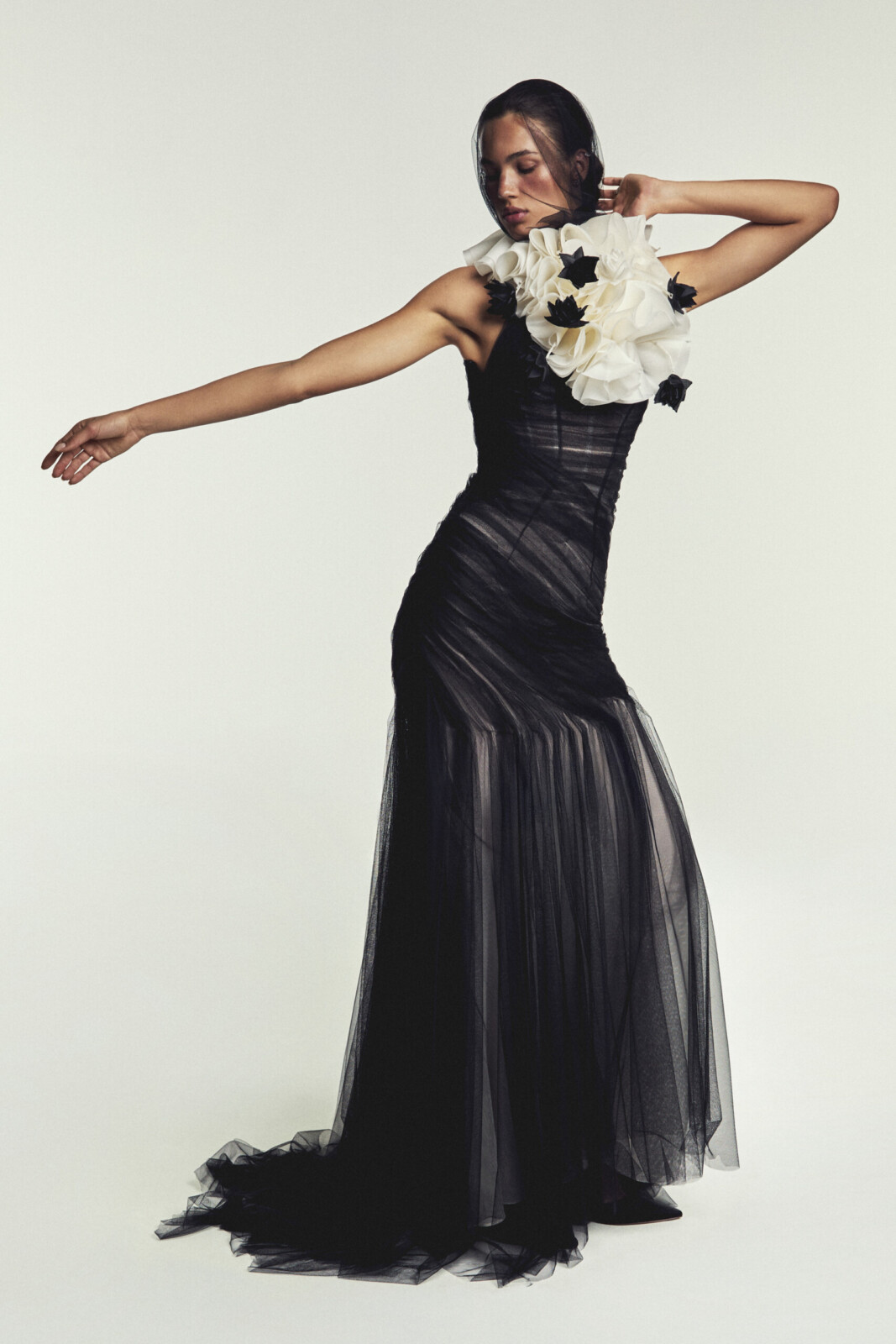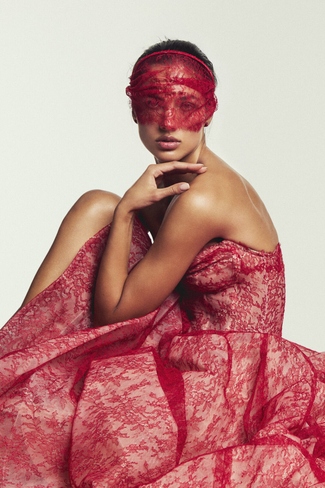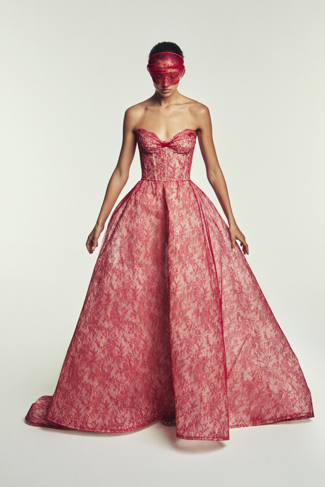Moments of contrast add depth — a striking red Chantilly lace gown evokes modern boudoir, while a noir draped tulle gown with a dramatic textured bib introduces bold, unexpected dimension.
