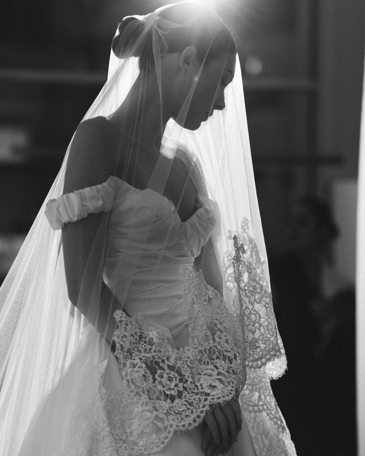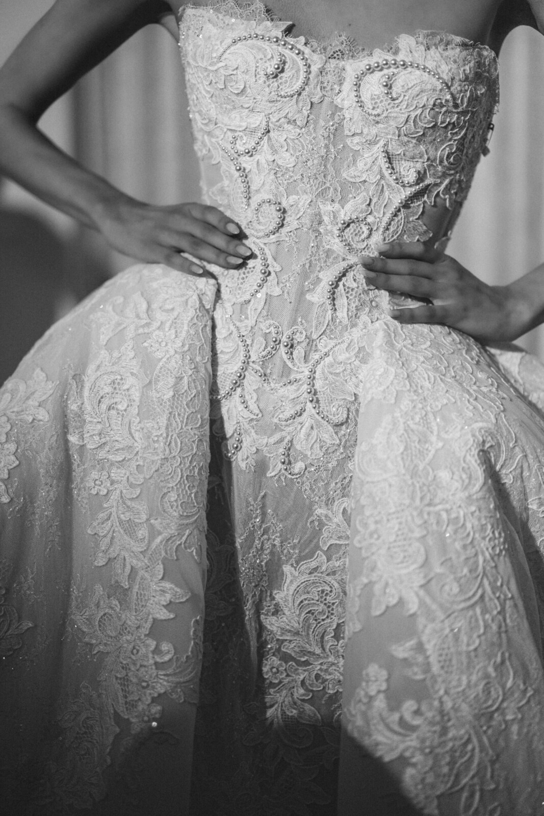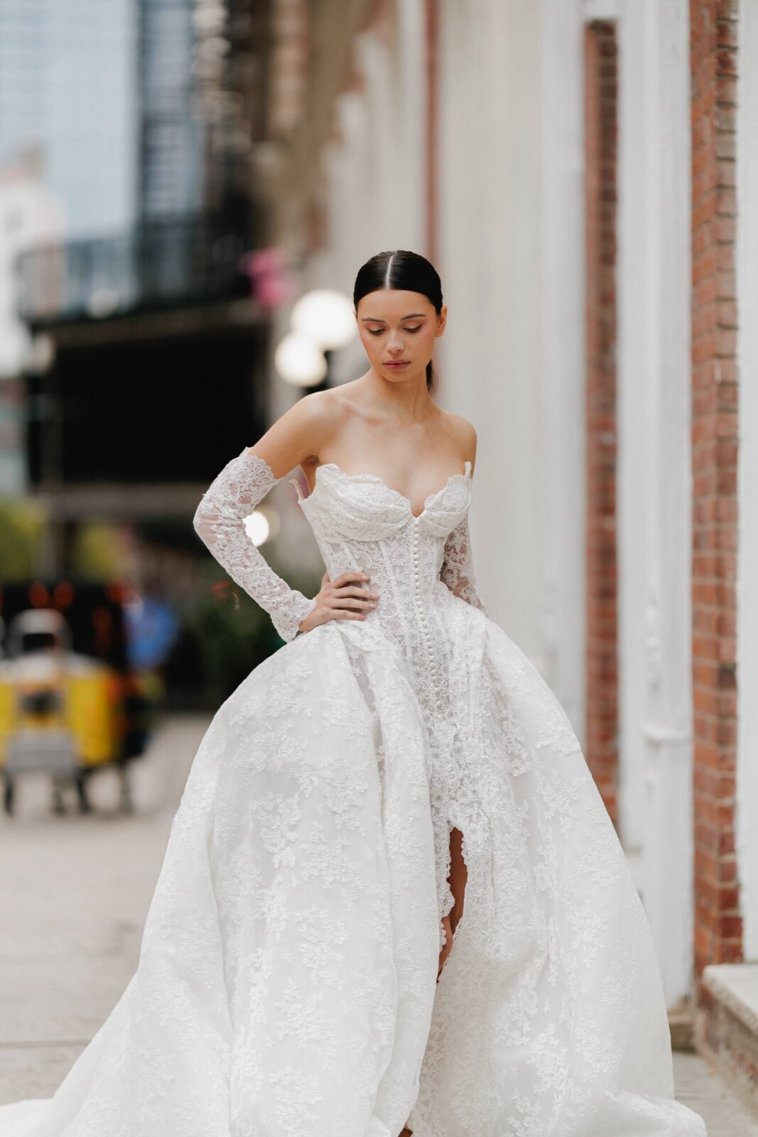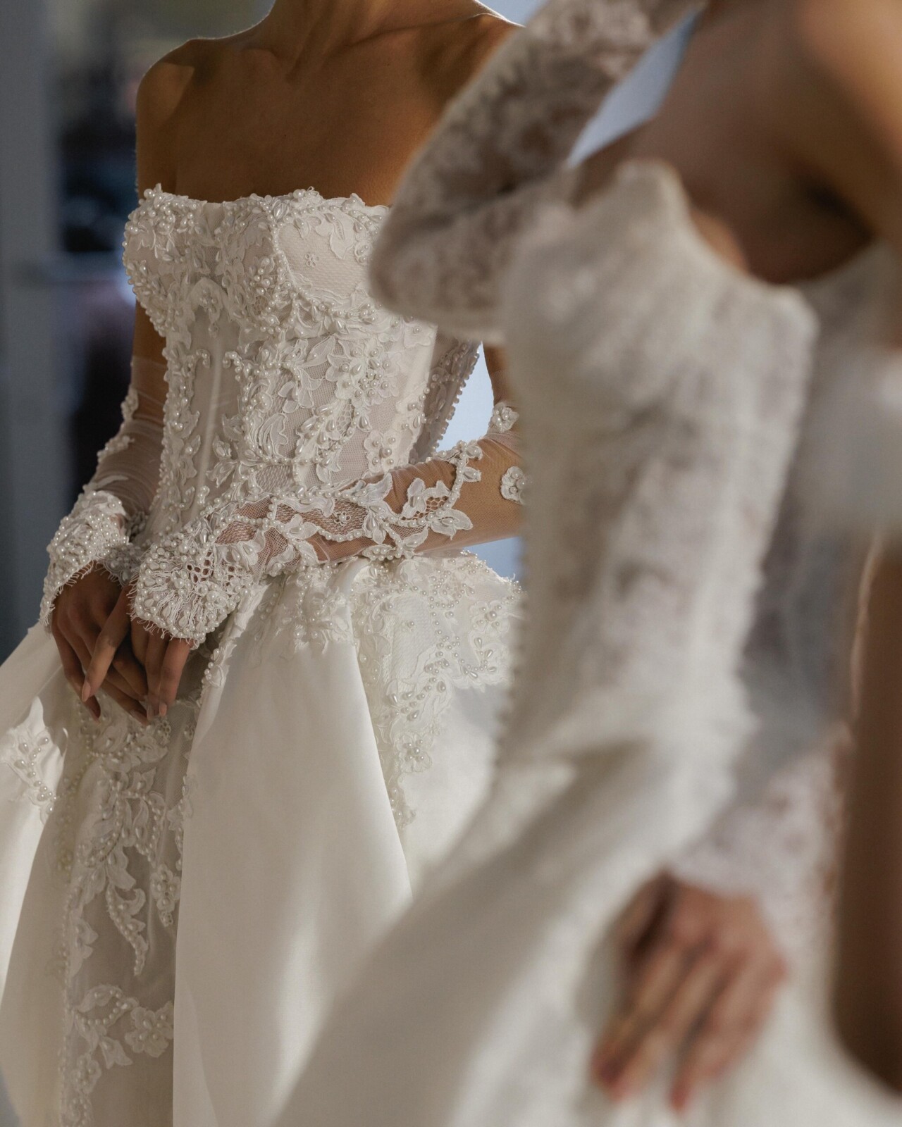 The collection highlights detailed, bespoke work, such as Chantilly lace, pearl embroidery, and removable, dramatic elements like capes.