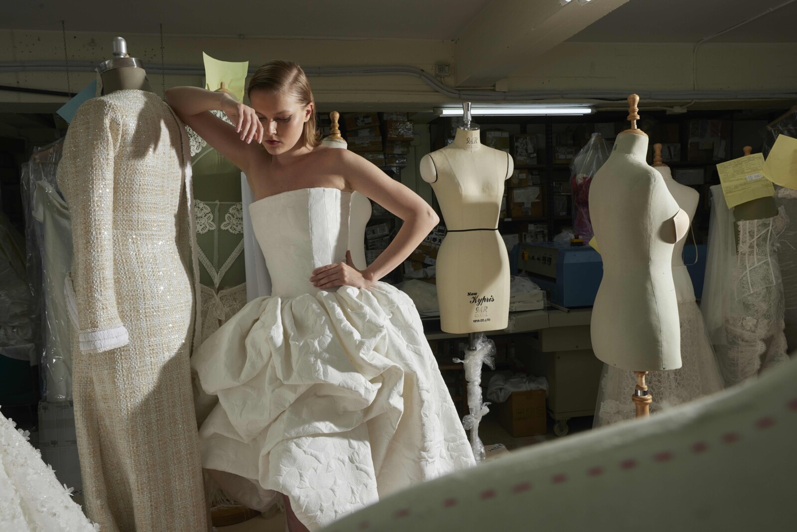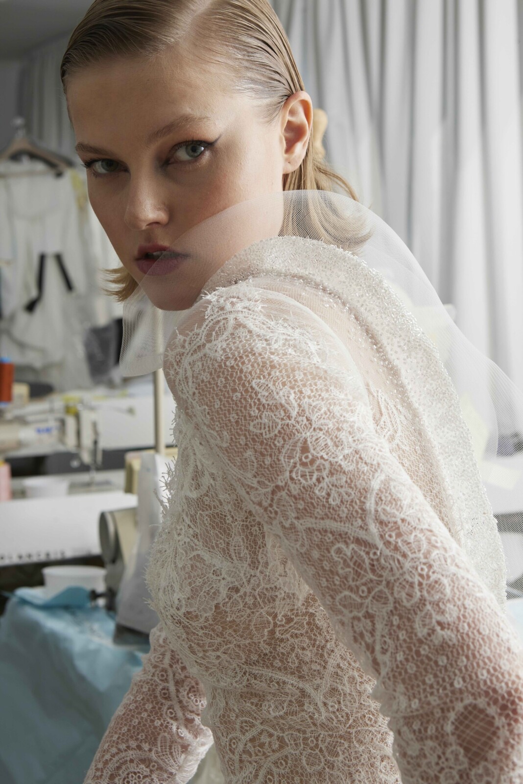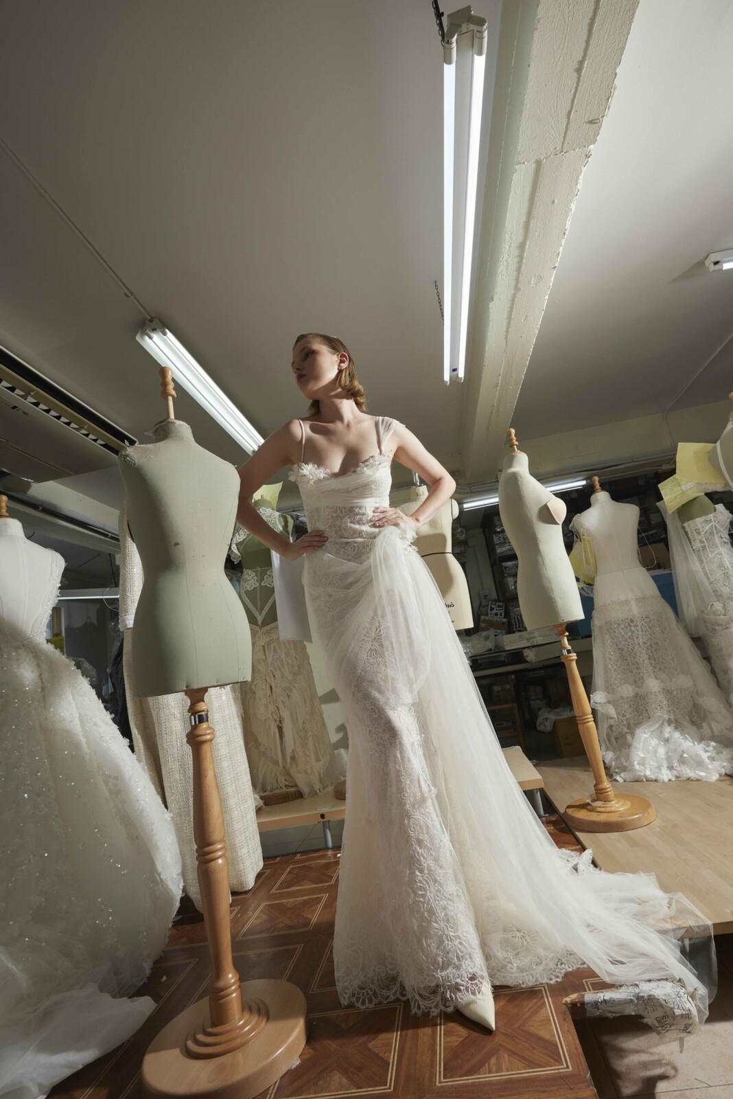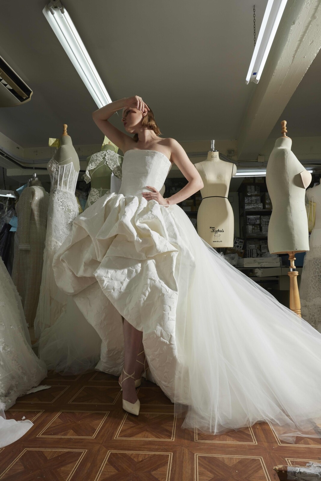 For Couture , we worked with hand -painted tulle, silk mikados, preserved and handmade flowers, hand-embroidered embellishments, Chantilly, and Calais lace — capturing eternally feminine beauty.