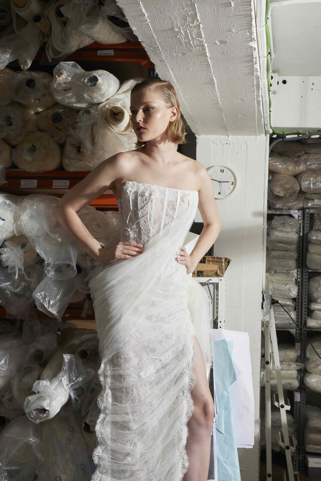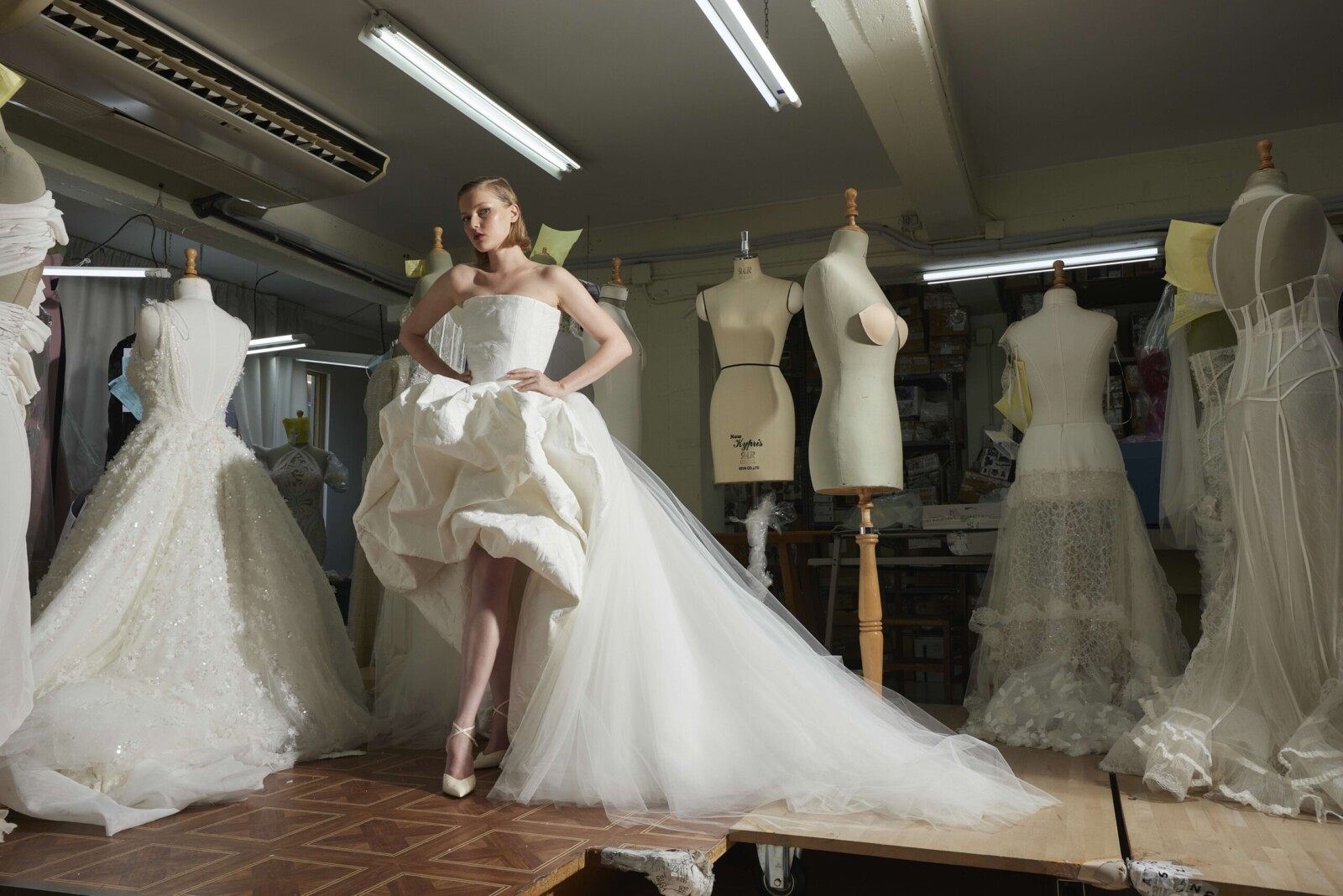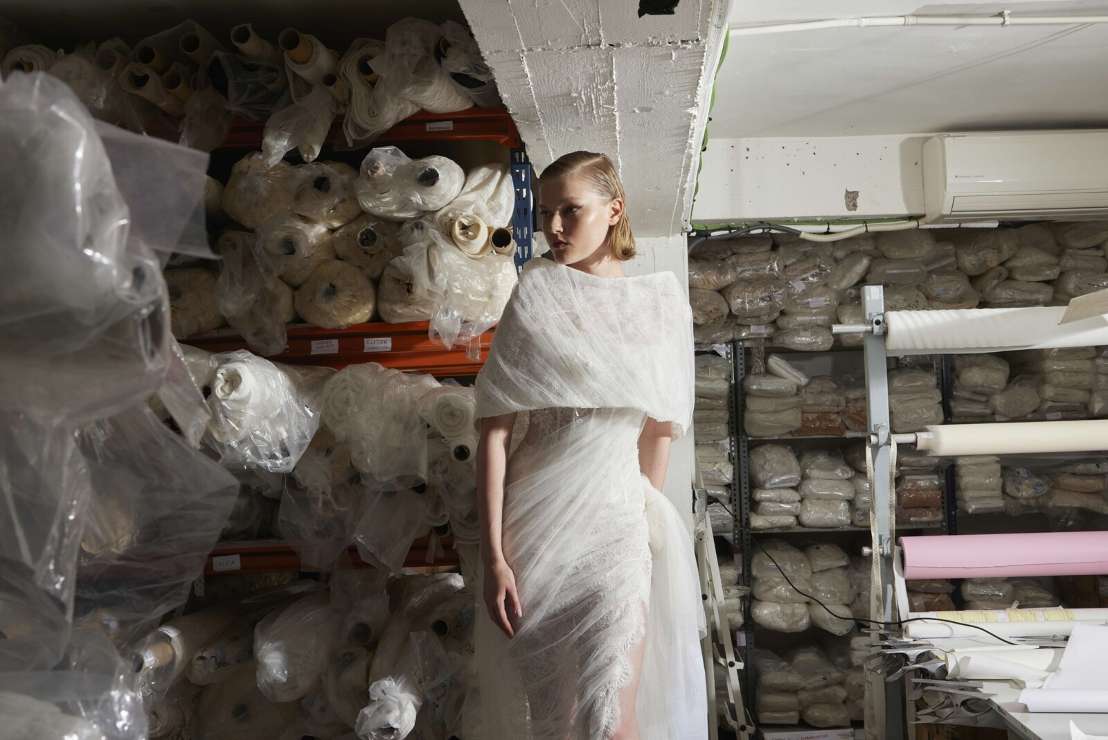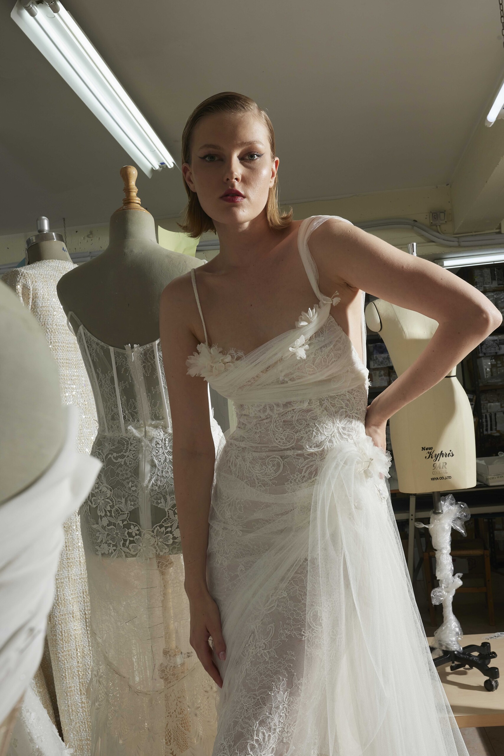 For Couture , we worked with hand -painted tulle, silk mikados, preserved and handmade flowers, hand-embroidered embellishments, Chantilly, and Calais lace — capturing eternally feminine beauty.