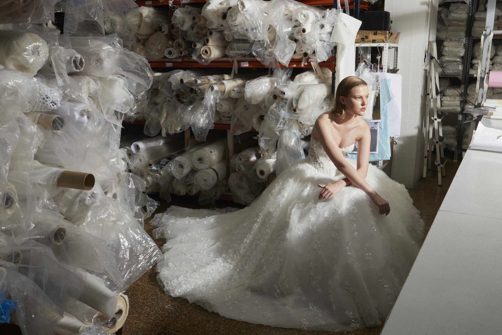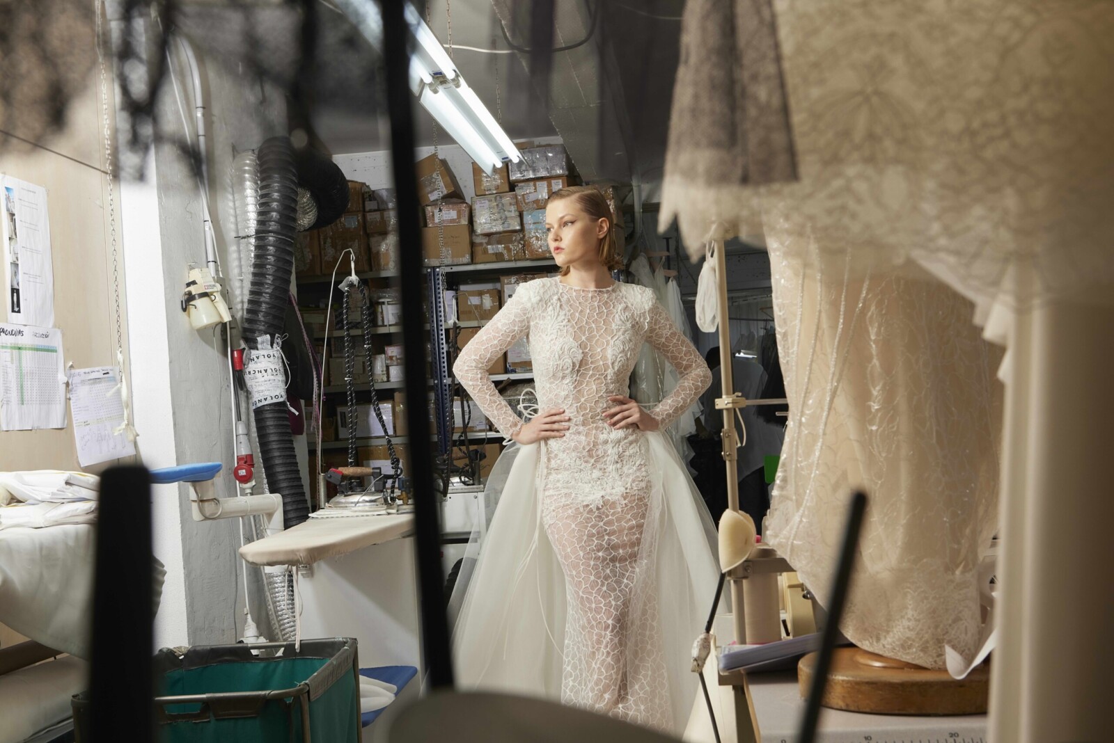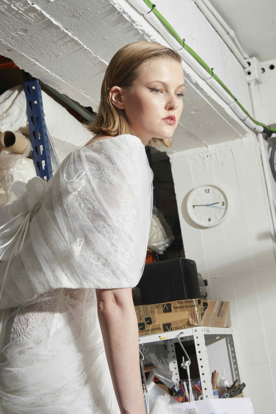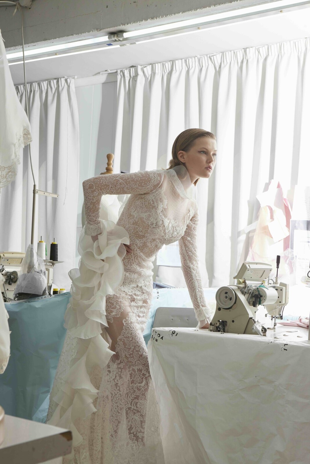 For Couture , we worked with hand -painted tulle, silk mikados, preserved and handmade flowers, hand-embroidered embellishments, Chantilly, and Calais lace — capturing eternally feminine beauty.