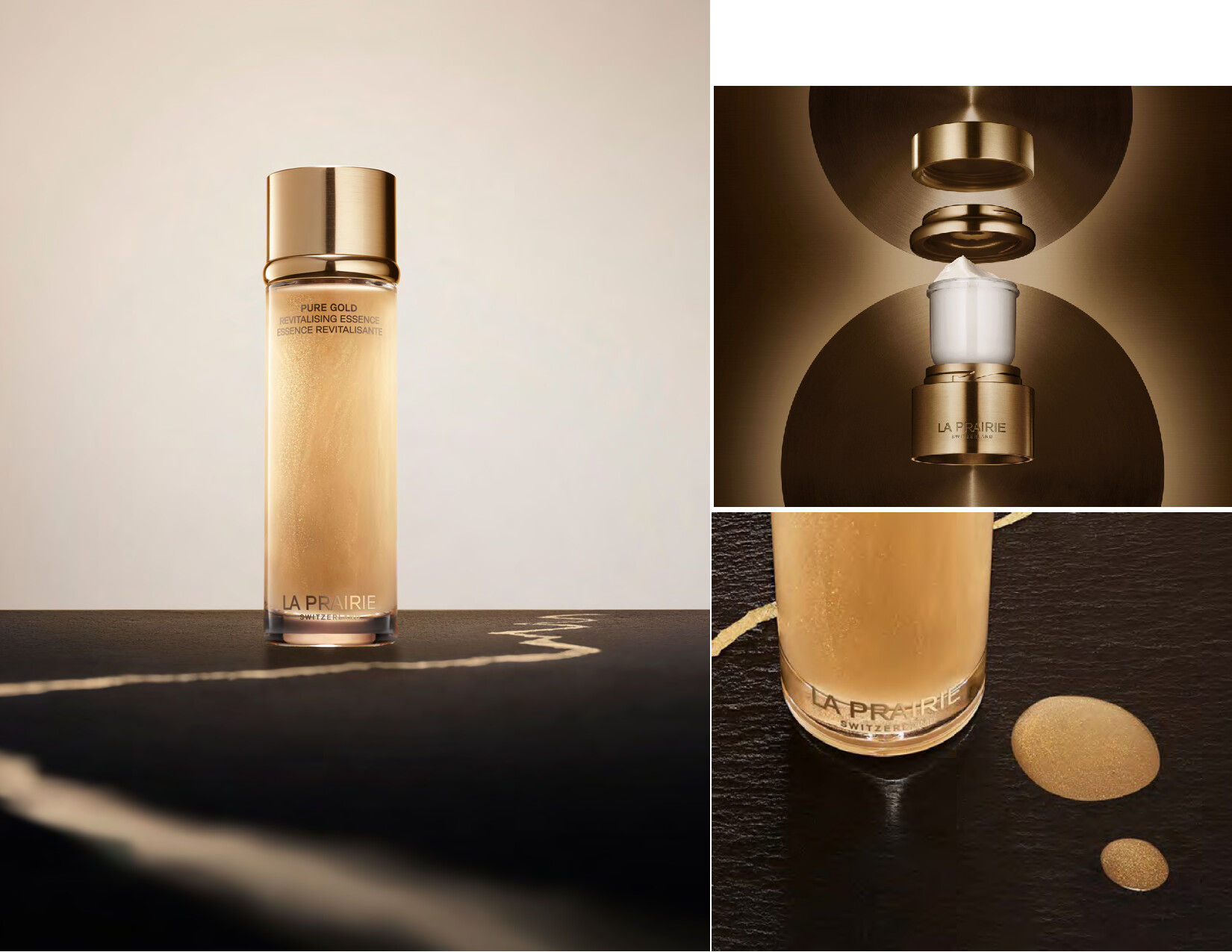 The Pure Gold Revitalizing Essence is the essential first step in La Prairie’s densifying and nourishing ritual. Morning and evening, after cleansing and toning, dispense a small amount into your palm and smooth gently over the face and neck, avoiding the eye area. Finish with light patting motions to encourage full absorption.