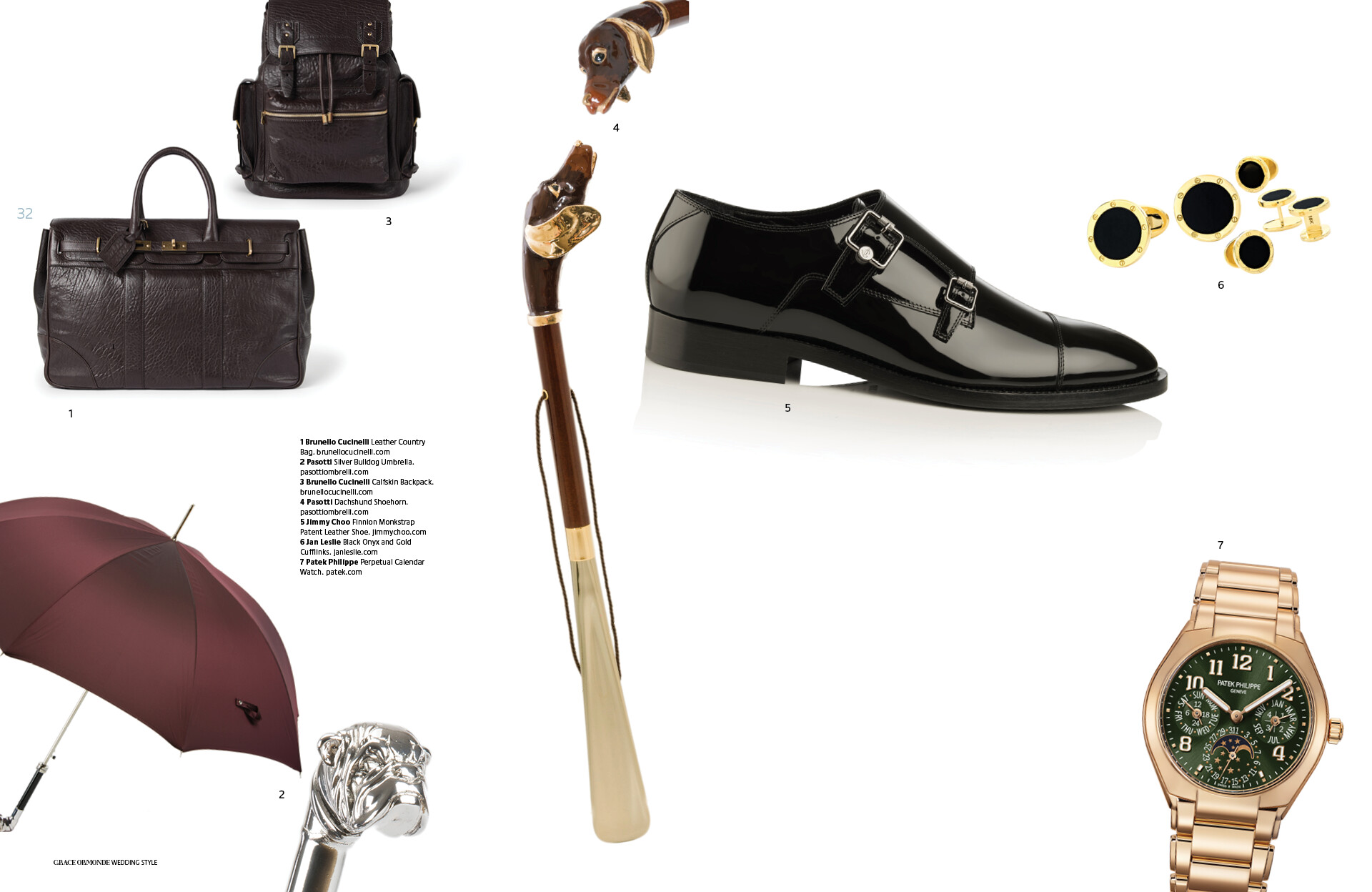 1 Brunello Cucinelli Leather Country Bag. 2 Pasotti Silver Bulldog Umbrella. 3 Brunello Cucinelli Calfskin Backpack. 4 Pasotti Dachshund Shoehorn. 5 Jimmy Choo Finnion Monkstrap Patent Leather Shoe. 6 Jan Leslie Black Onyx and Gold Cufflinks. 7 Patek Philippe Perpetual Calendar Watch.