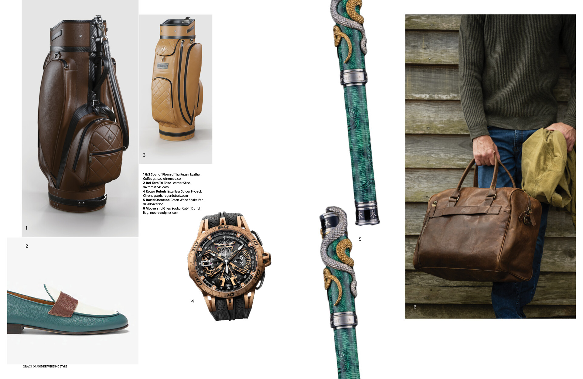 1 & 3 Soul of Nomad The Regan Leather Golf Bags. 2 Del Toro Tri-Tone Leather Shoe. 4 Roger Dubuis Excalibur Spider Flyback Chronograph. 5 David Oscarson Green Wood Snake Pen. 6 Moore and Giles Booker Cabin Duffel Bag.