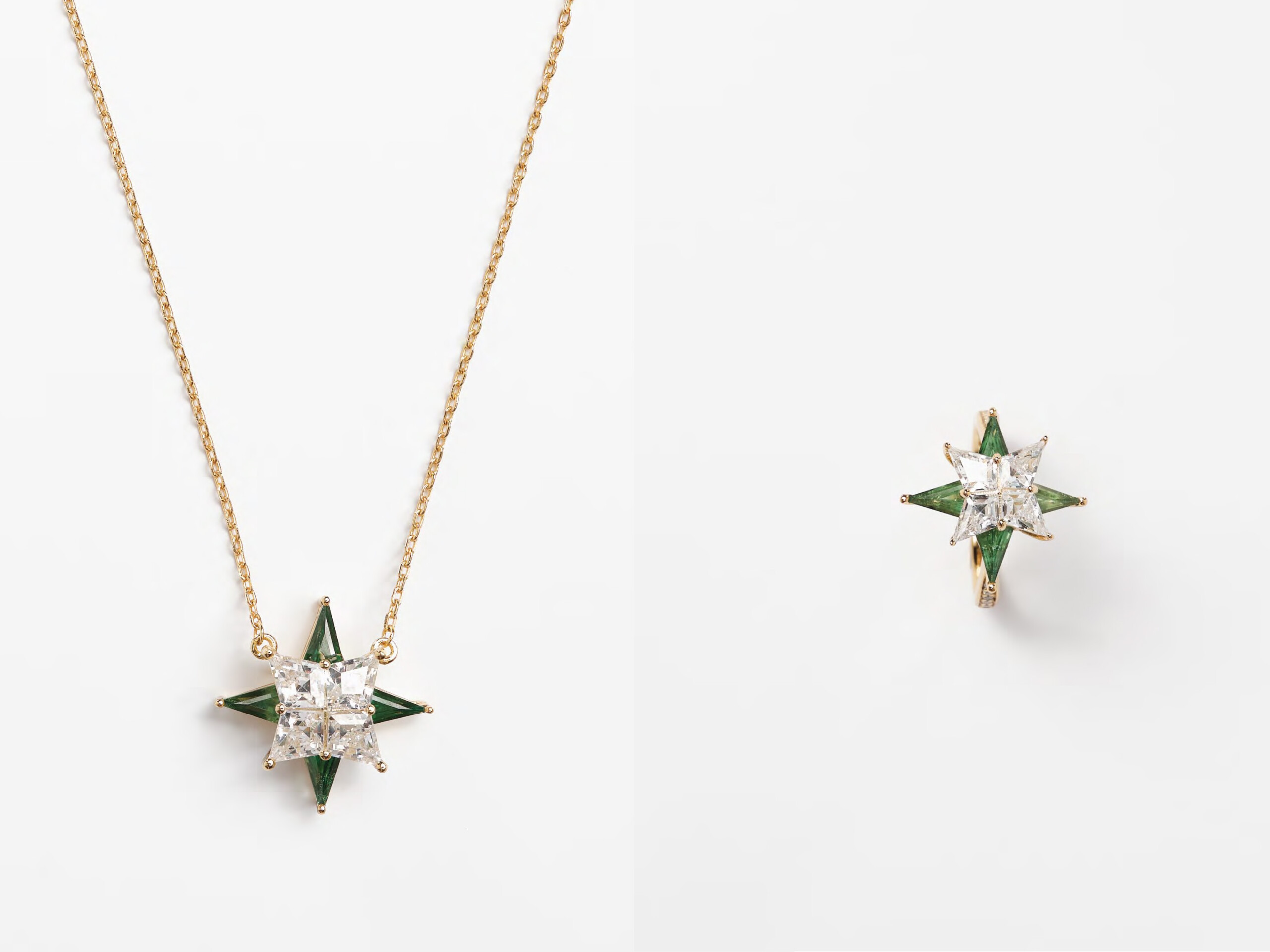 Our fine jewelry collection is designed around the 11 Juillet star-shaped motif and are crafted from the same carefully selected materials—malachite, mother of pearl, onyx, and ethically sourced diamonds.