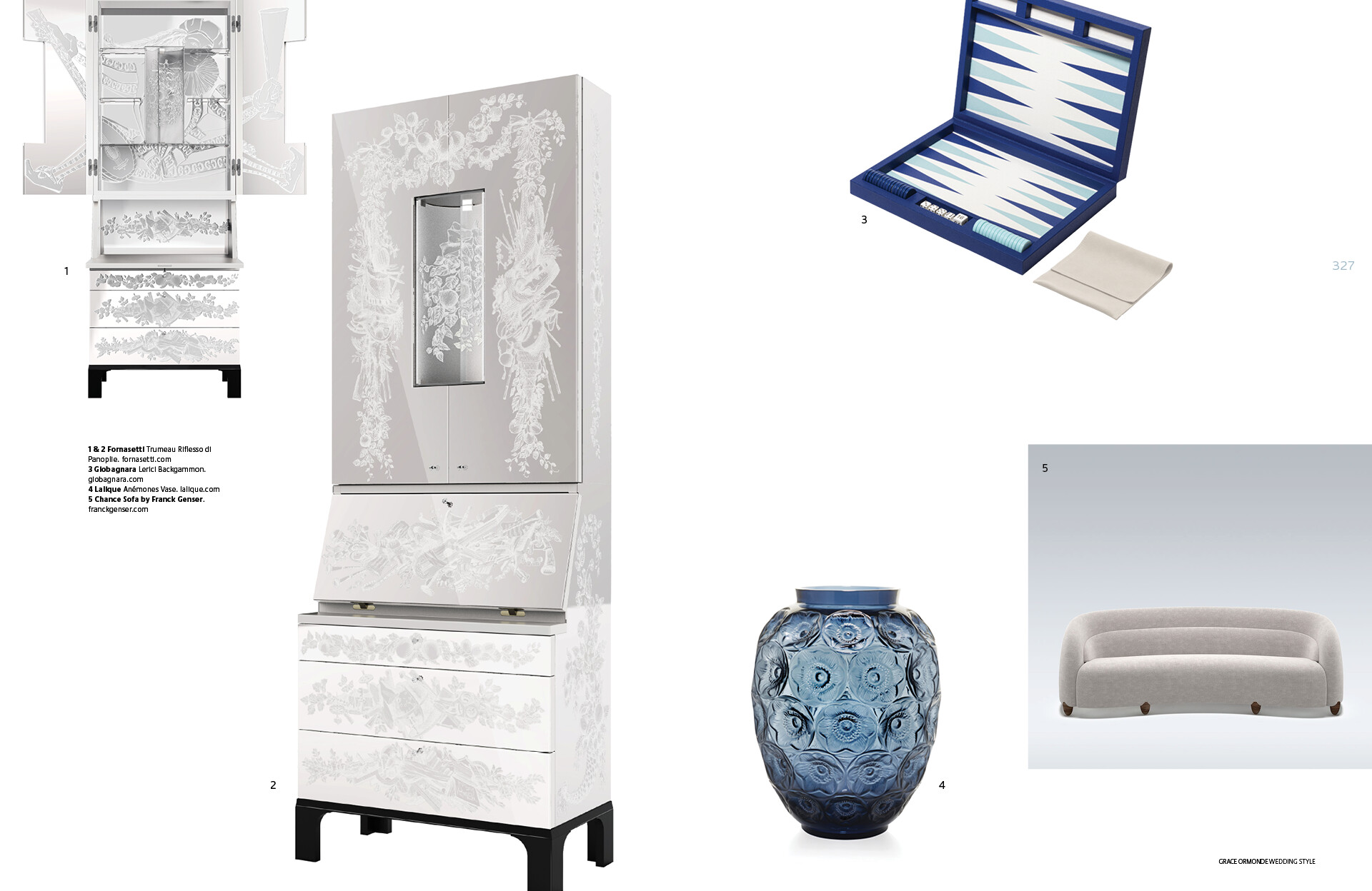 1 & 2 Ottiu Seraphine Dining Chair. 3 Lalique IBEX Sculpture. 4 Fornasetti Trumeau Litobar Specchio Magico. 5 Ottiu Lyra Ottoman.