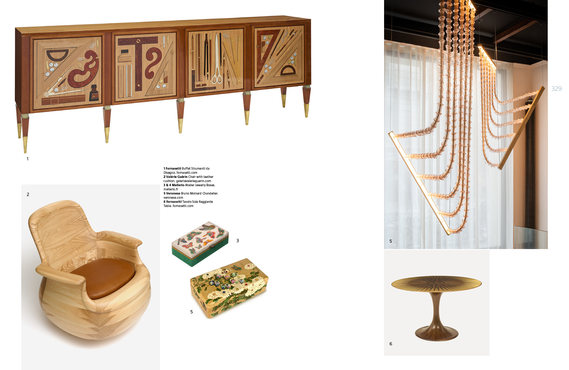 1 Fornasetti Buffet Strumenti da disegno. 2 Valérie Guérin Chair with leather cushion. 3 & 4 Mellerio Jewelry Boxes. 5 Veronese Chandelier. 6 Fornasetti Tavolo Sole Raggiante.