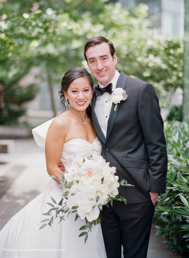 When the wedding day arrived, the bride and groom were married in front of 240 guests at Christ Lutheran Church in Baltimore, Maryland and hosted their reception at the Four Seasons in Harbor East. Corinne wore an elegant Oscar de la Renta ballgown with a custom bow, and Tom sported a classic Ted Baker tuxedo. For her “something blue,” Corinne also carried a handkerchief passed down to all the brides on Tom’s side of the family, with all their names embroidered on it in pale blue.