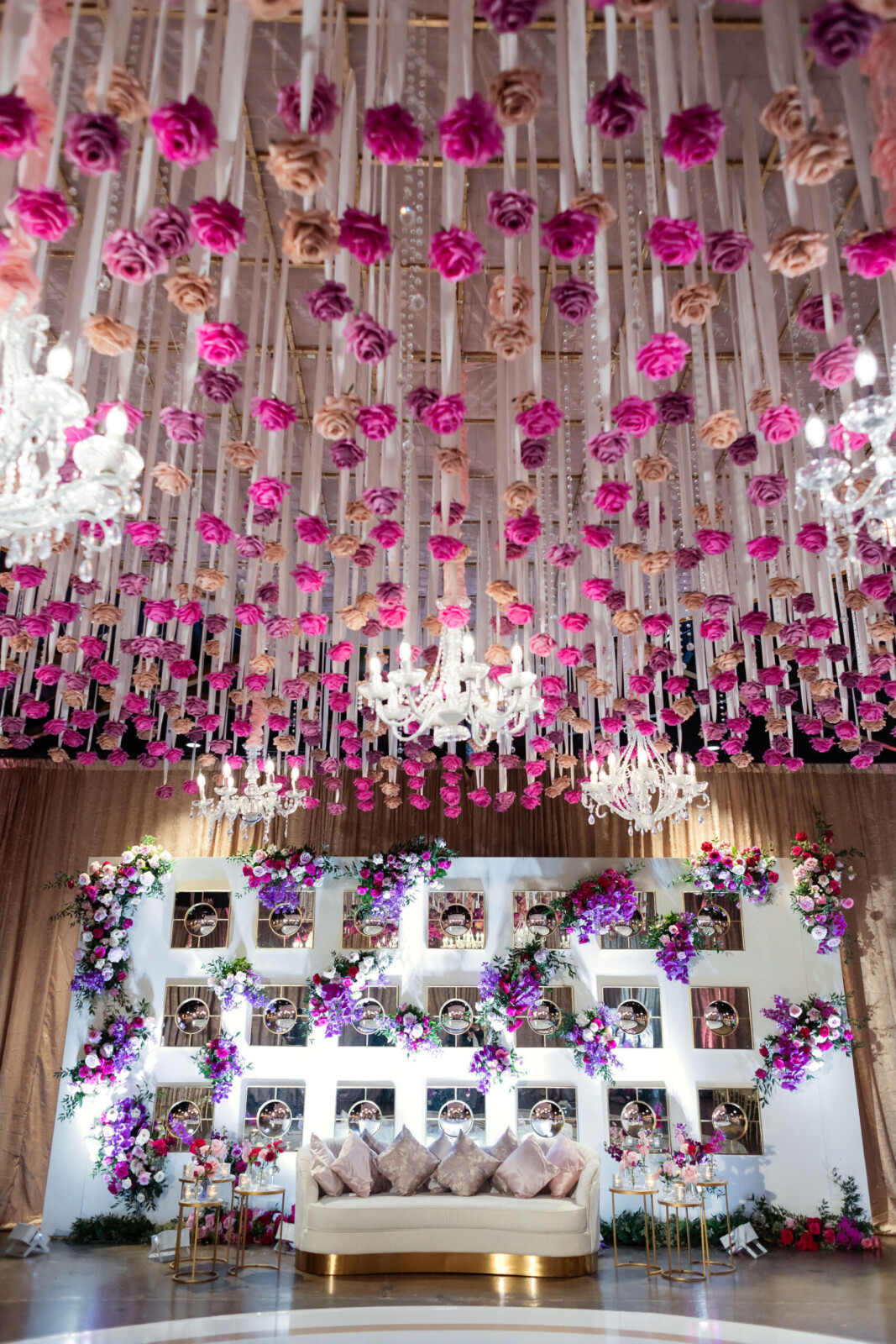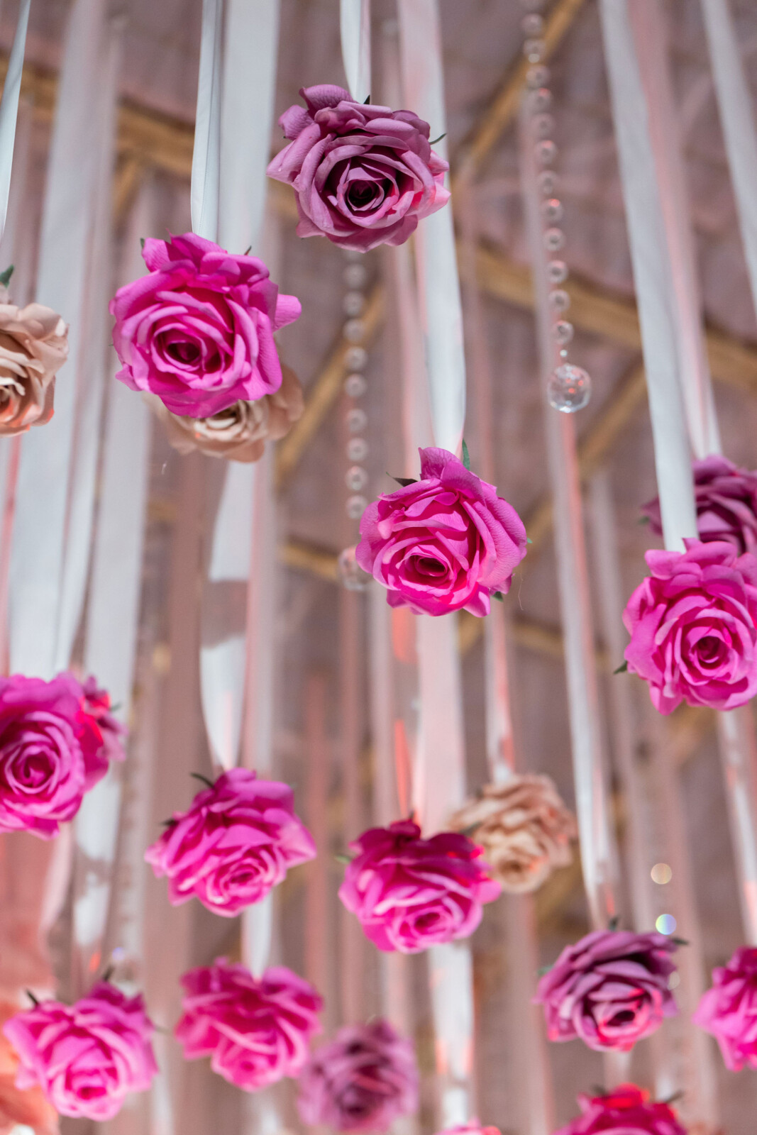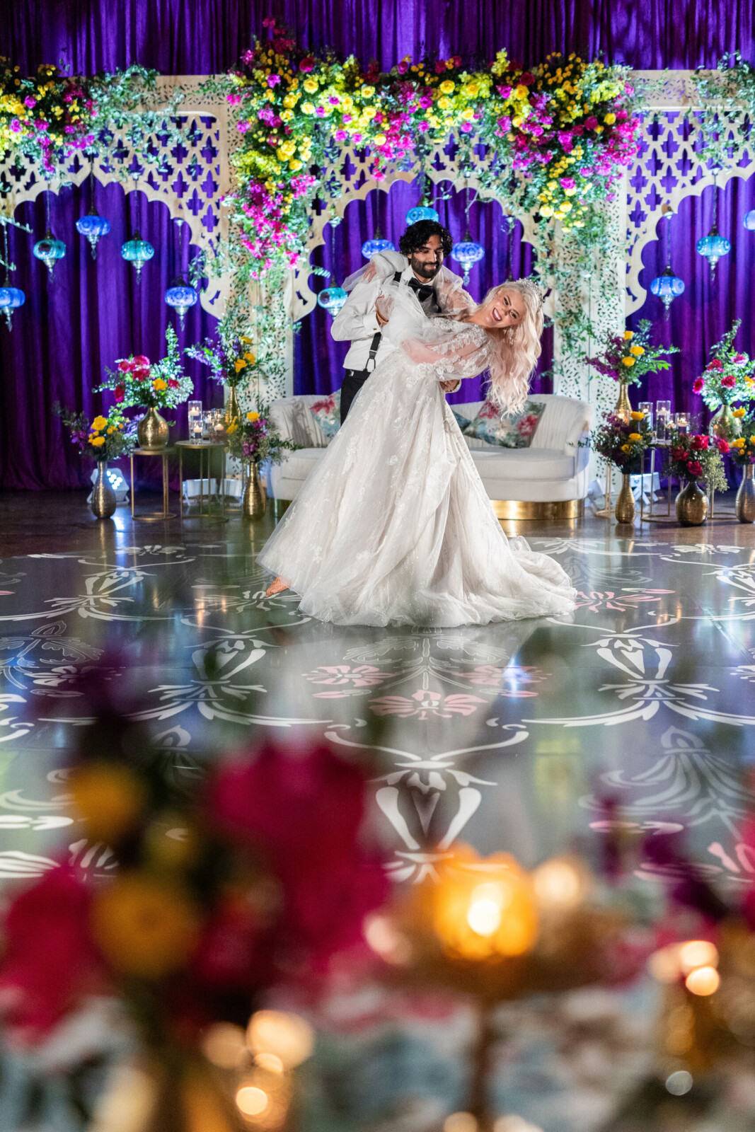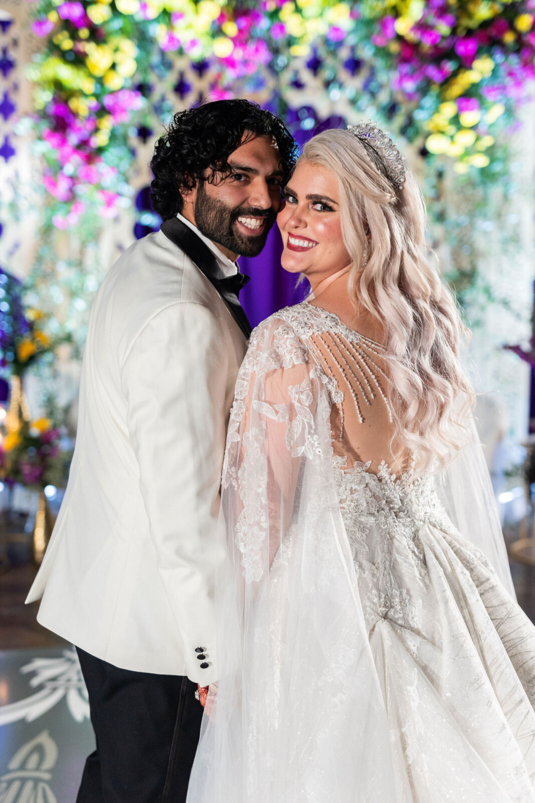 Every detail of the couple’s wedding weekend felt like stepping into a dream. The colorful wedding décor was breathtaking, with flowers covering every surface, and design focal points including a chandelier made entirely out of roses. The tall candle centerpieces gave the room a dramatic, romantic glow – a nod to the bride’s love for The Phantom of the Opera.
