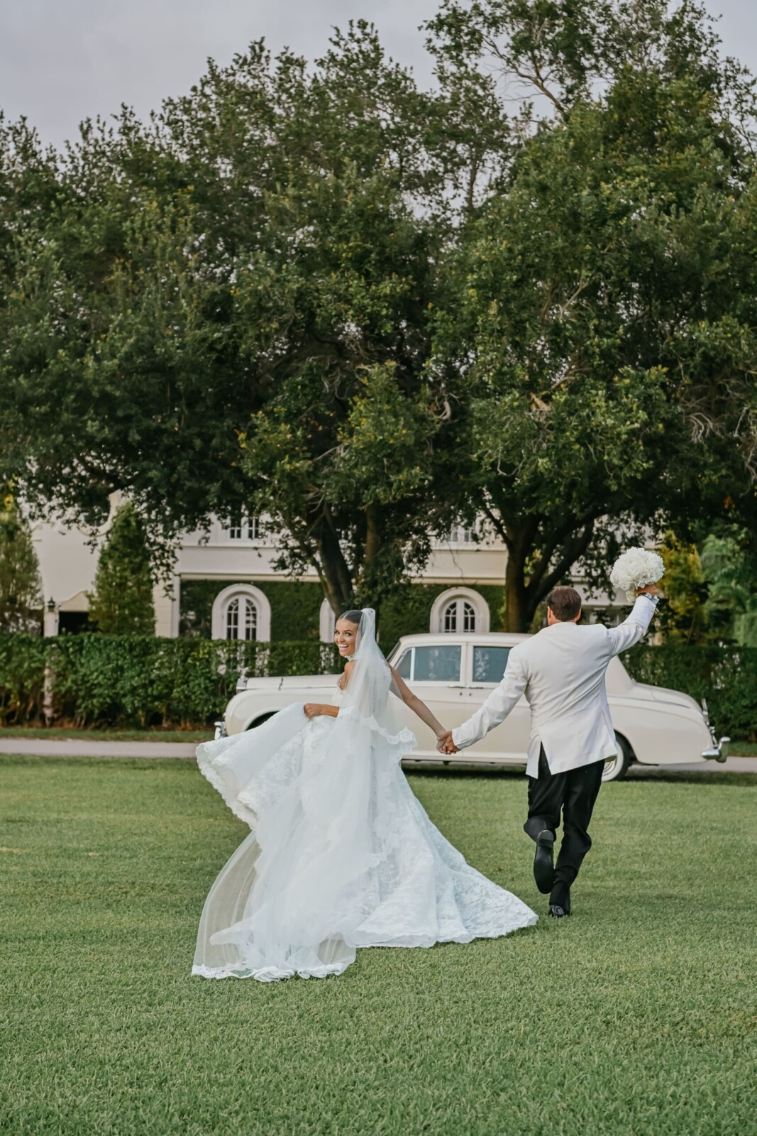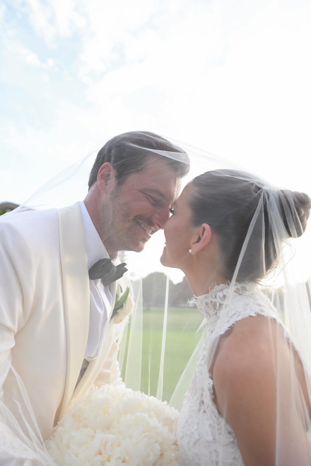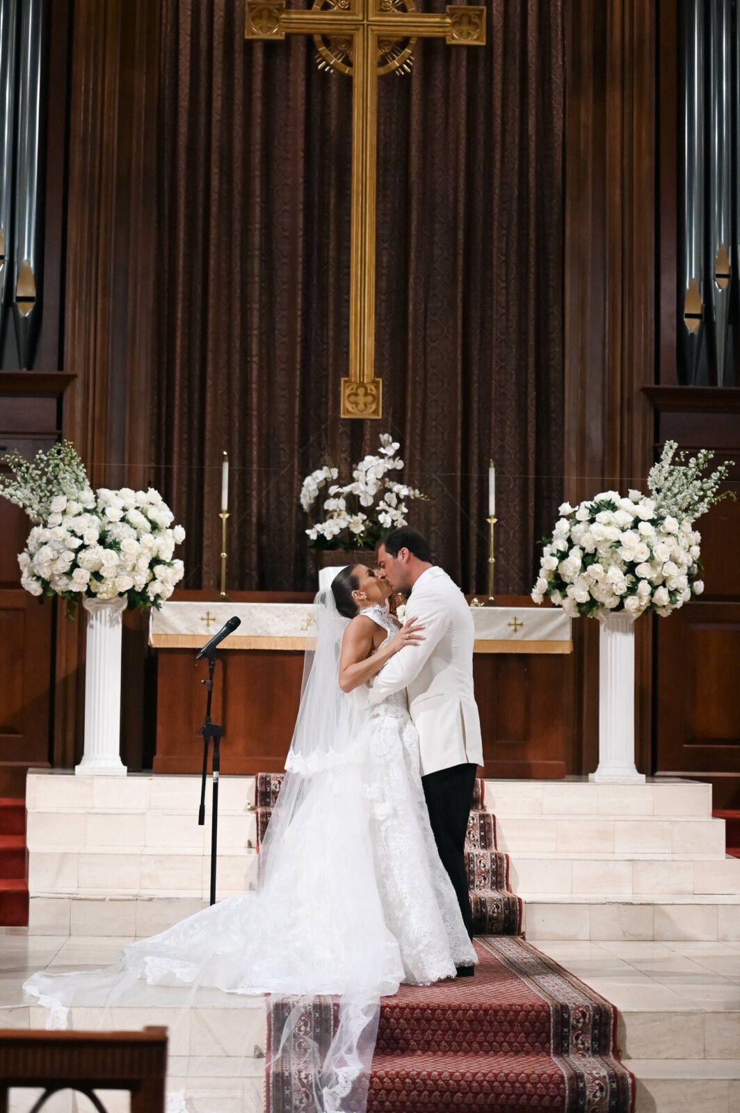 When the big day arrived, the bride was dressed in the “Vittoria” wedding gown by Monique Lhuillier, along with the Vittoria Halter Jacket and a Dior mantilla veil—all, purchased at Chic Parisien in Coral Gables. Her look was completed by a pair of simple Prada ballet flats, which she chose solely with the dance floor in mind. The groom wore a Ralph Lauren Purple Label dinner jacket, inspired by James Bond.