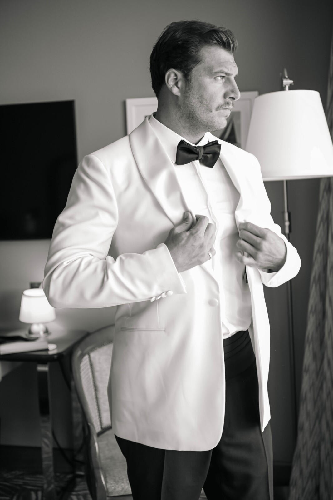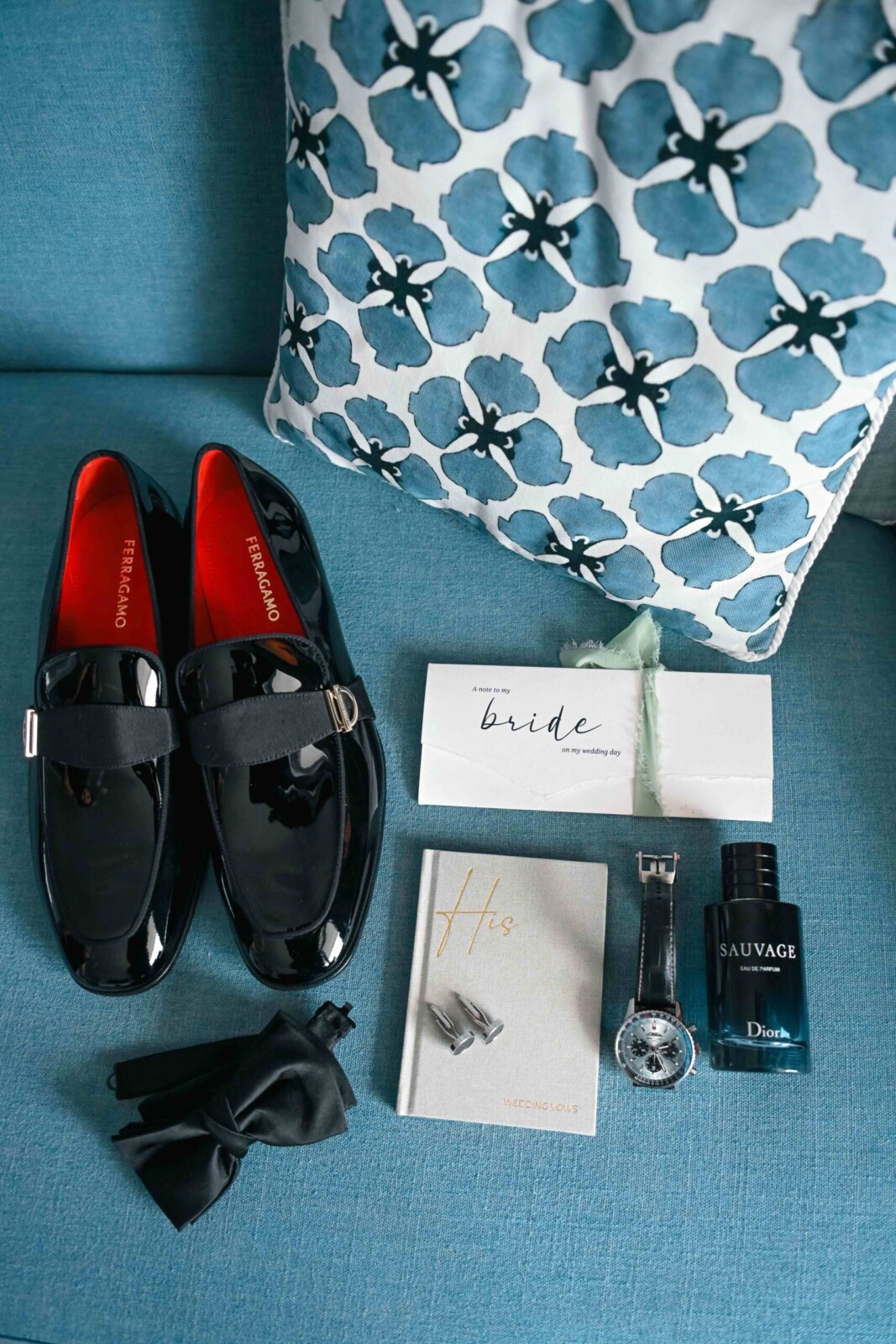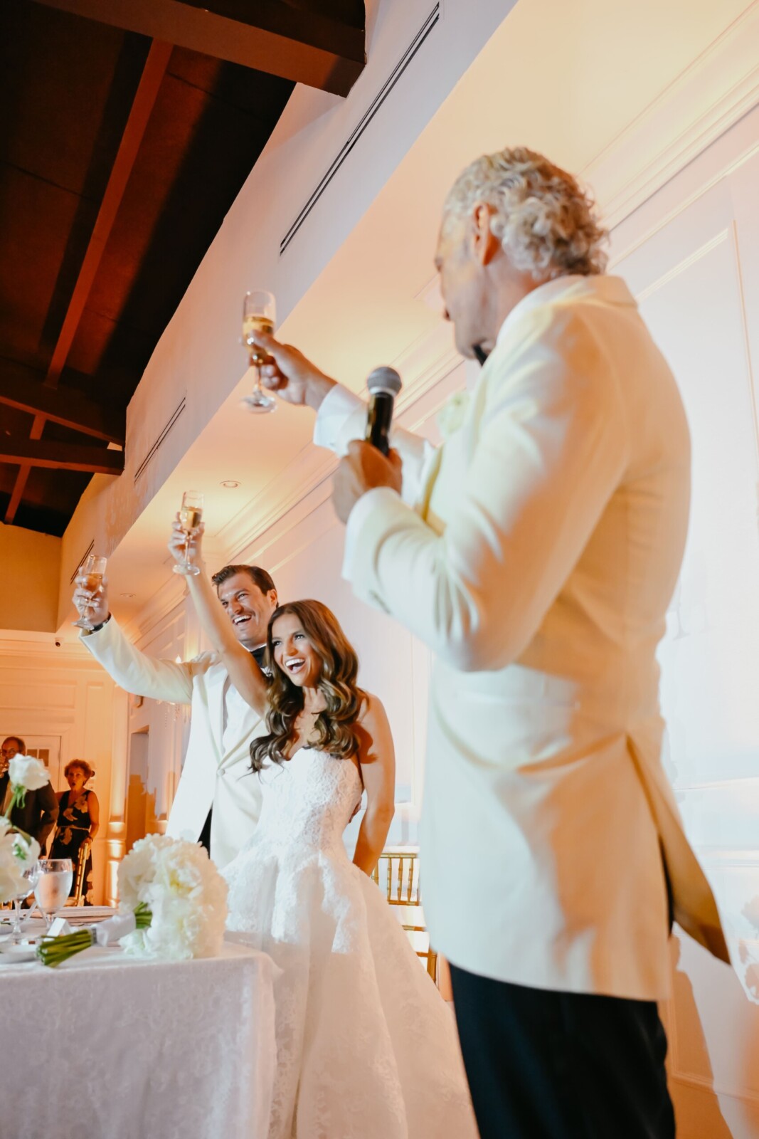 When the big day arrived, the bride was dressed in the “Vittoria” wedding gown by Monique Lhuillier, along with the Vittoria Halter Jacket and a Dior mantilla veil—all, purchased at Chic Parisien in Coral Gables. Her look was completed by a pair of simple Prada ballet flats, which she chose solely with the dance floor in mind. The groom wore a Ralph Lauren Purple Label dinner jacket, inspired by James Bond.