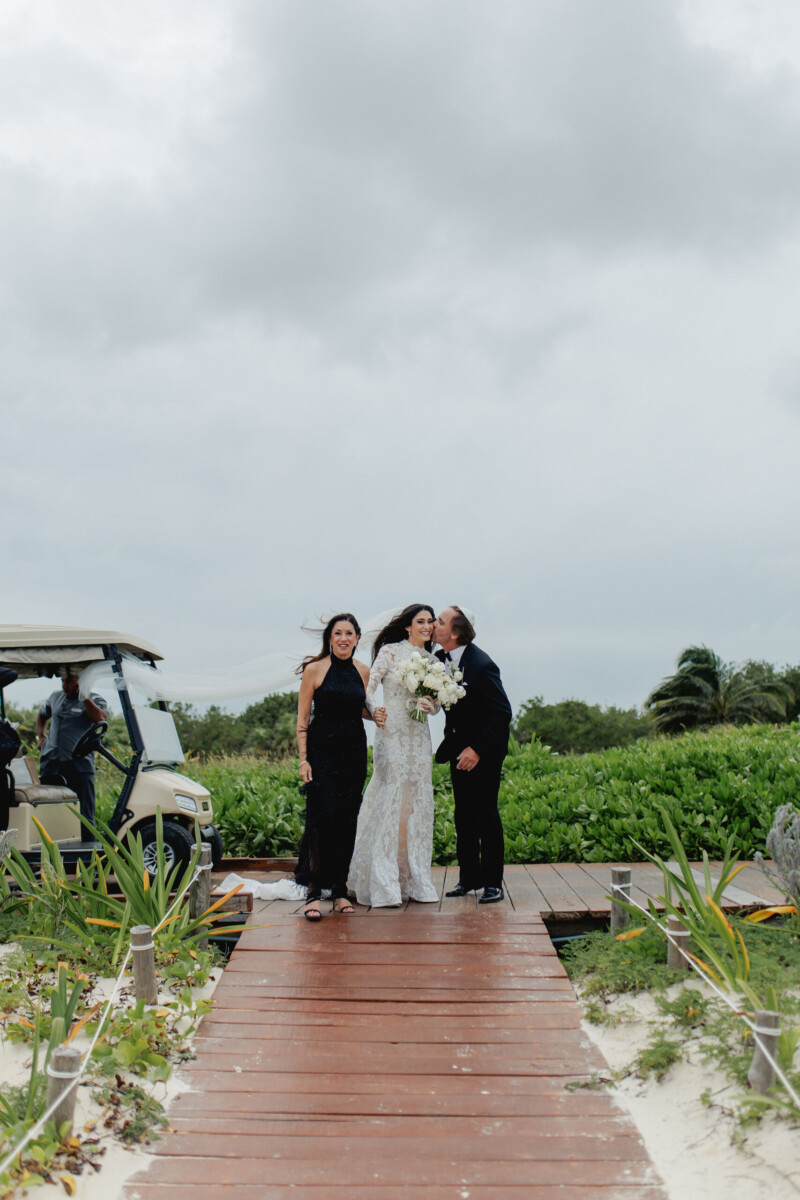 “DJ Dulce brought the energy we hoped for, reading the room effortlessly and keeping the dance floor packed all night,” says the bride. “Vanessa Jaimes designed florals that were nothing short of extraordinary – lush arrangements in rich tones that perfectly reflected the natural beauty of Mayakoba while adding a romantic, modern flair. Our guests dined under the stars, surrounded by candlelight, enjoying an exquisite menu that celebrated local flavors with refined technique.