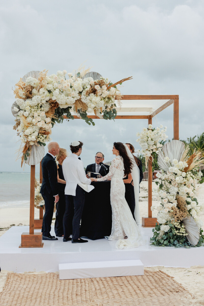 With the gentle sound of the ocean and the soft rustle of palm leaves in the background, the couple exchanged vows during a heartfelt wedding ceremony. That dreamlike setting transitioned seamlessly into the reception, where a luxurious and intimate atmosphere was brought to life.
