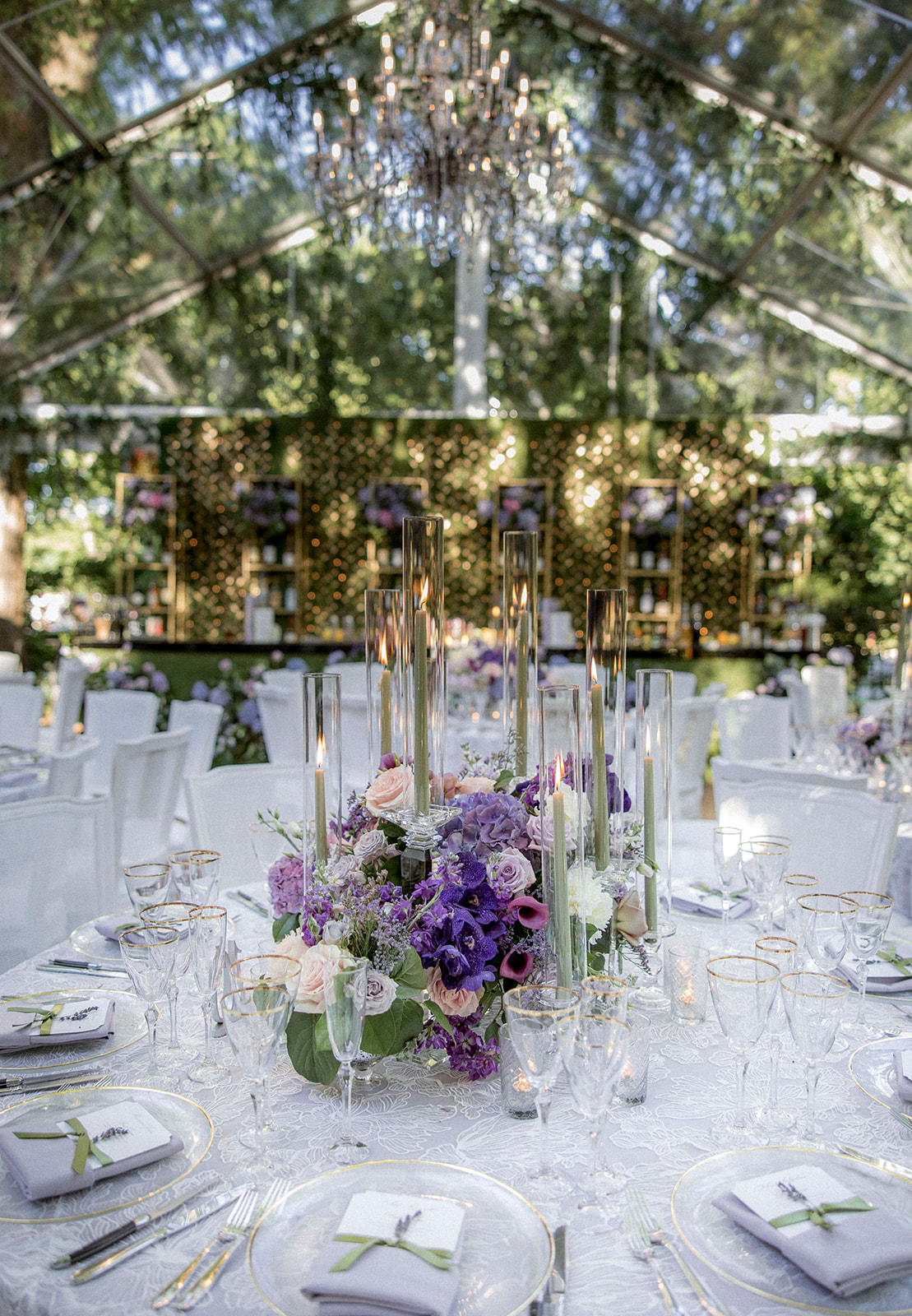 On the eve of their wedding, the bride and groom kicked things off with a gathering of family and close friends on the rooftop terrace of the Gaansvoort Hotel in the Meatpacking District. Jessica Rose, an amazing singer from Nashville, TN kept the group dancing through the evening. When the wedding day arrived, Tavern on the Green had been transformed into the magical garden that Julie had envisioned. The couple picked an outside courtyard at Tavern on the Green for the actual ceremony. Julie’s vision was inspired Crazy Rich Asians, one of her favorite movies. Konstantino’s, the floral designer for the occasion, understood this inspiration and executed the perfect design scheme: a magical garden with a cascading waterfall as a backdrop, with overflowing purple florals, butterfly motifs, and even a mirrored walkway to simulate a walking-on-water effect.