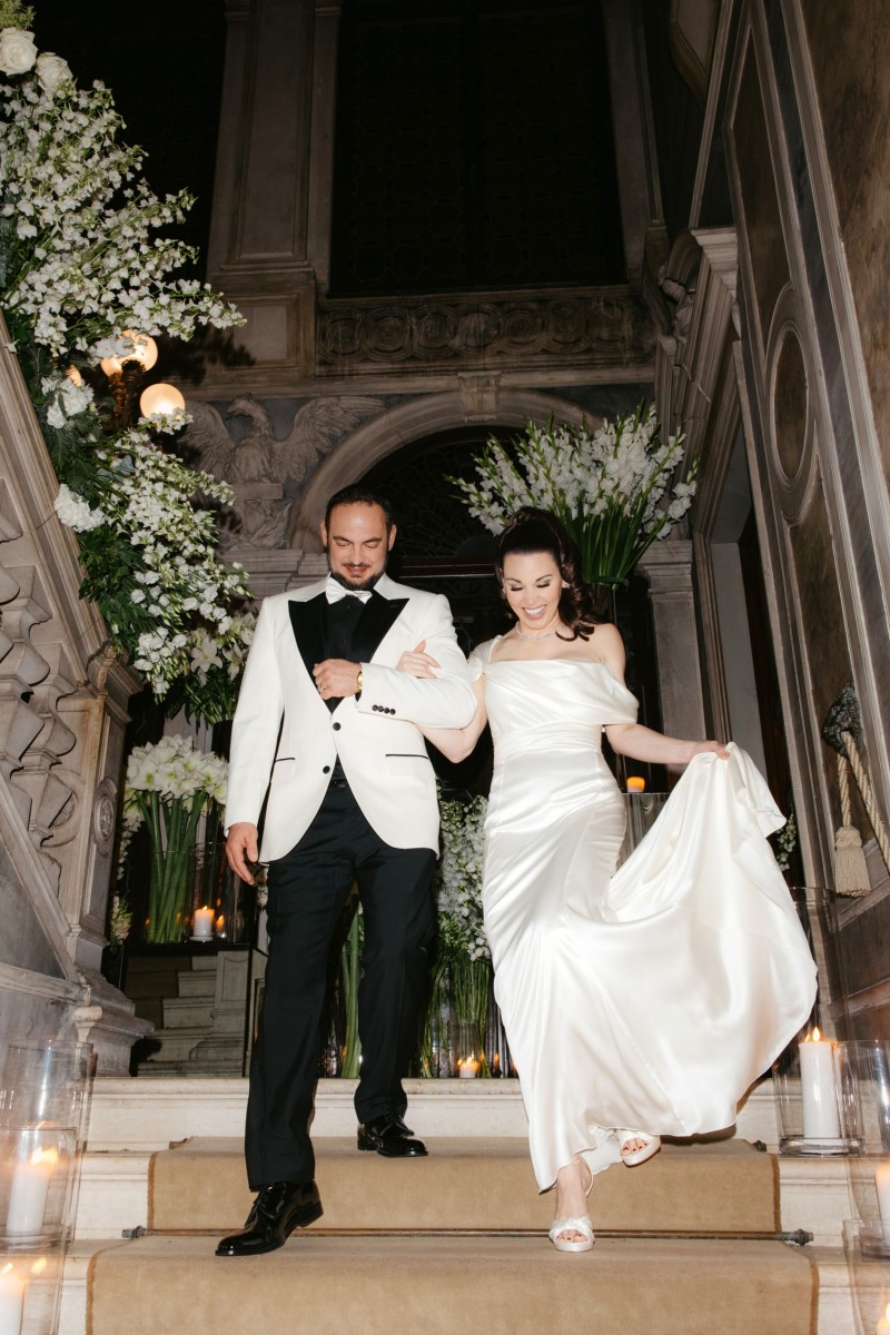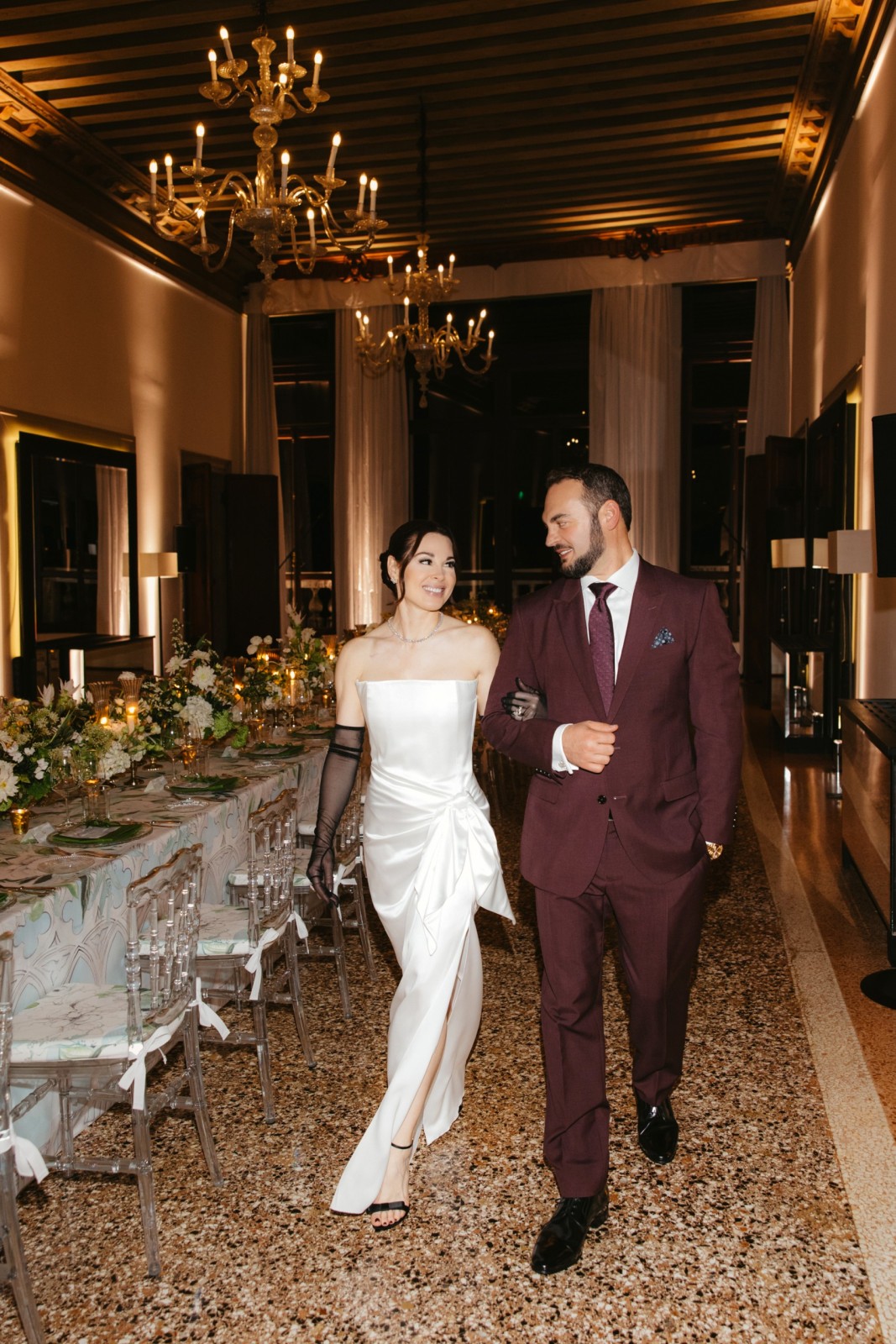 After the ceremony, guests enjoyed a Venetian-style aperitif with cicchetti, spritz, and live jazz music. Every corner of Aman Venice – even the piano at the entrance to the Ballroom – was decorated with white flowers, crystal candelabras, and candles. To welcome the guests in the majestic dining room, a pianist and four violinists dressed in champagne-colored ensembles while they played love ballads.