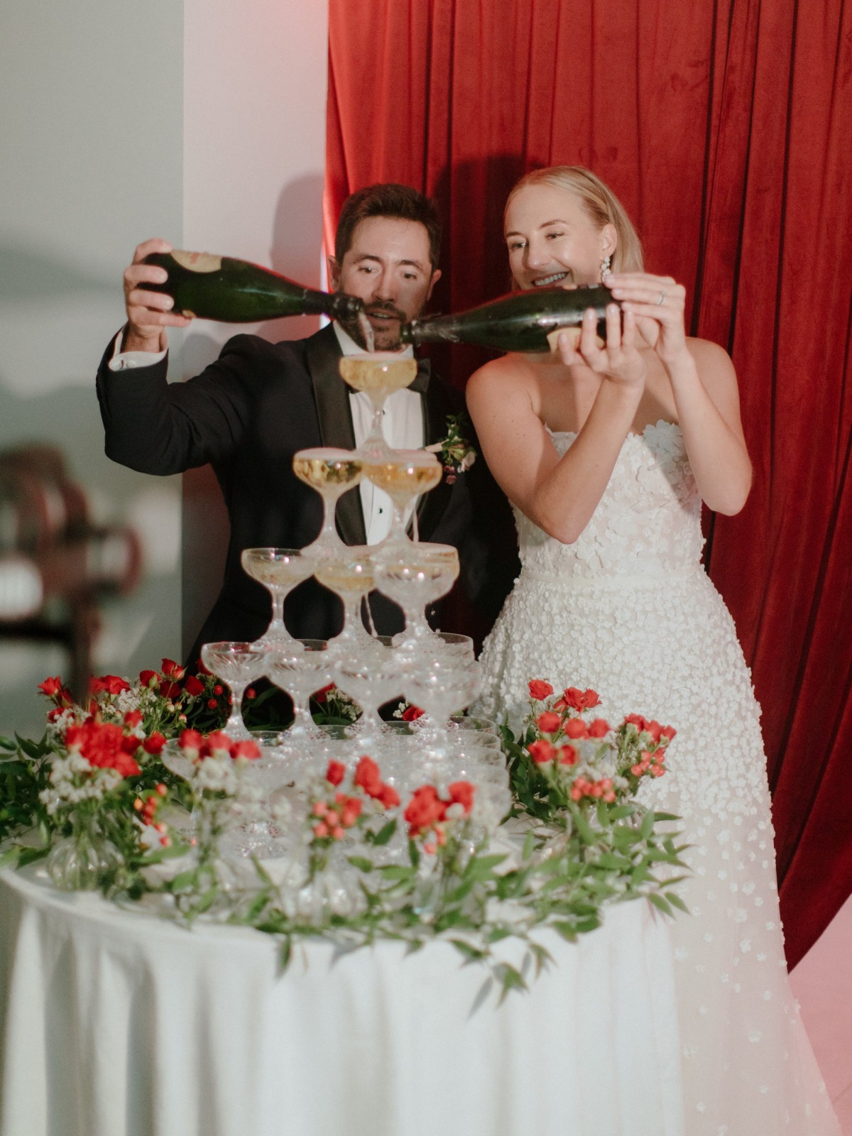 “JoAnn and the team at Cigarral de las Mercedes did a wonderful job creating an elegant and fun atmosphere for our guests,” says the bride. “From the whimsical flower arrangements to the added touch of olive branches picked from the olive trees on property that morning, there wasn’t a detail left untouched. The idyllic countryside setting provided a serene backdrop for the ceremony and cocktail hour while the Casona offered guests a historic place to dine. After the reception, we went straight to the Lake House where the space was converted to an ‘underground discotheque’ – complete with disco balls and red velvet – where we danced until 4:30 a.m.