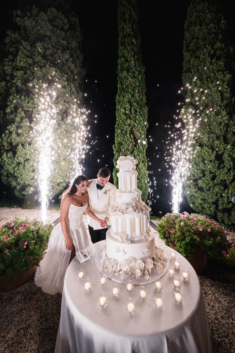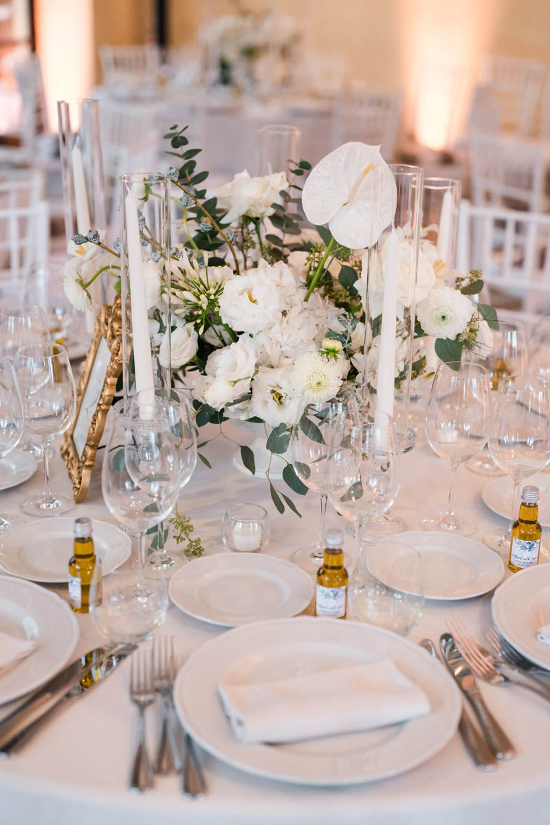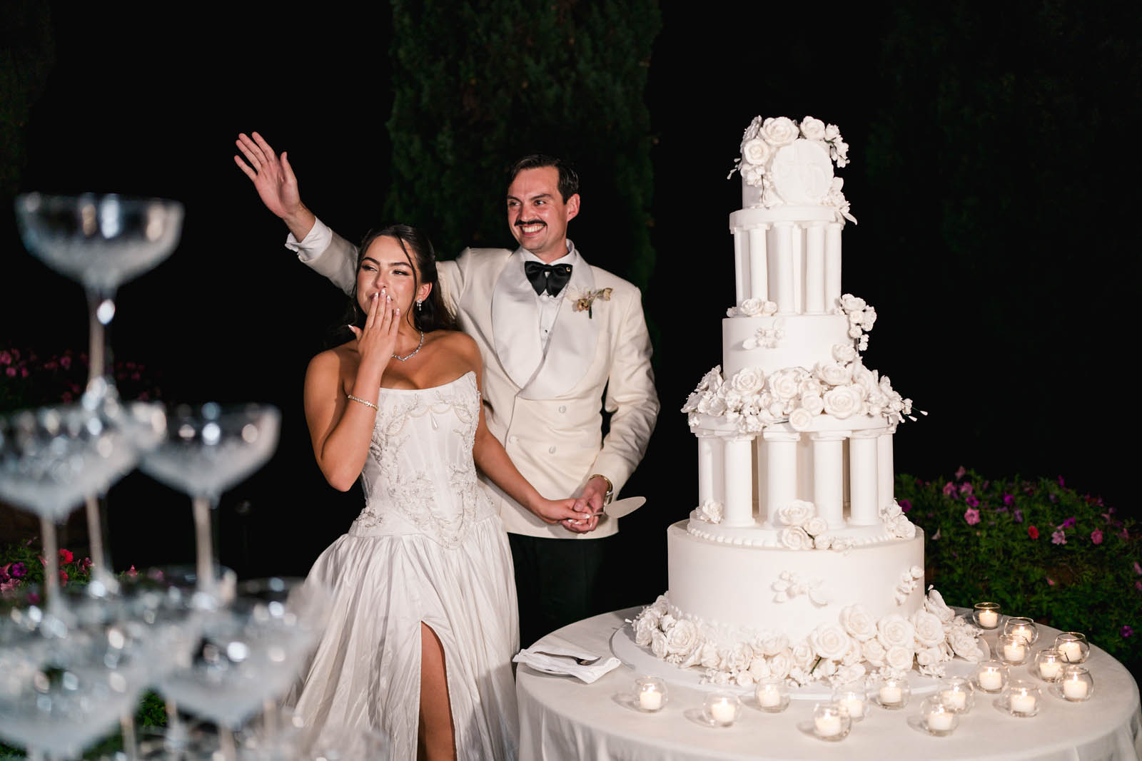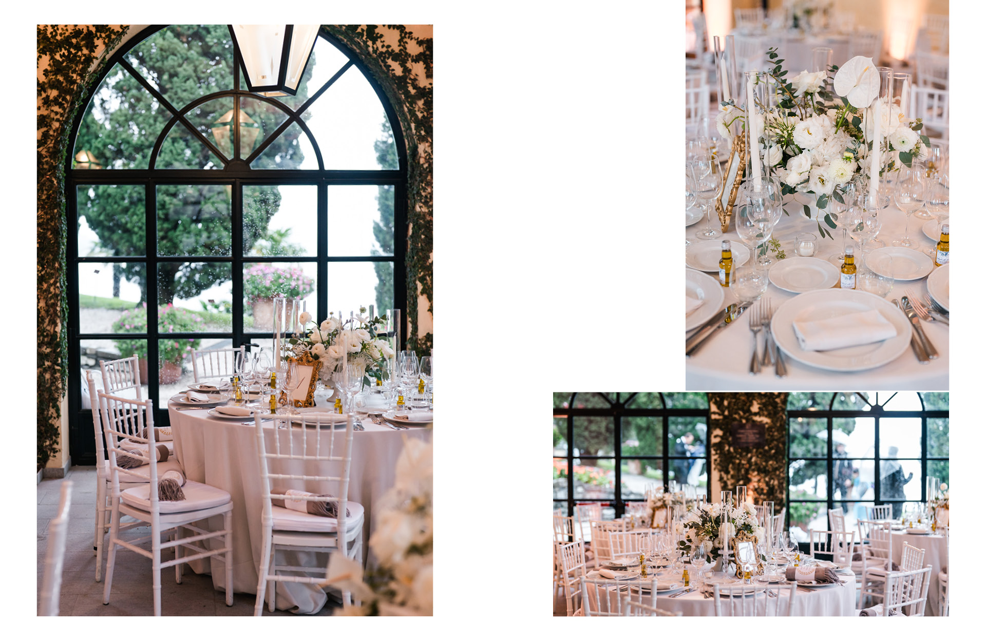 “We wanted a celebration that was elegant, traditional, and authentically Italian,” Aileen explains. “The décor featured timeless white florals, gold accents, and candlelight that reflected off the lake’s surface. The highlight of the night came when three tenors surprised our guests with a live performance during dinner—an unexpected touch that left everyone speechless. We also had a live painter capturing the evening on canvas, transforming each guest into part of our story.”