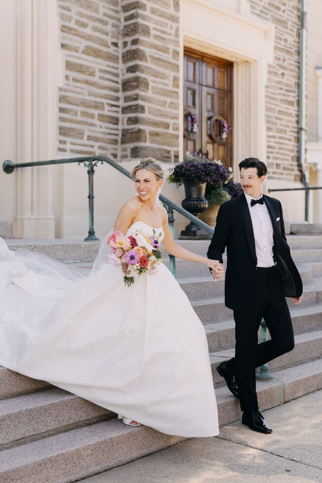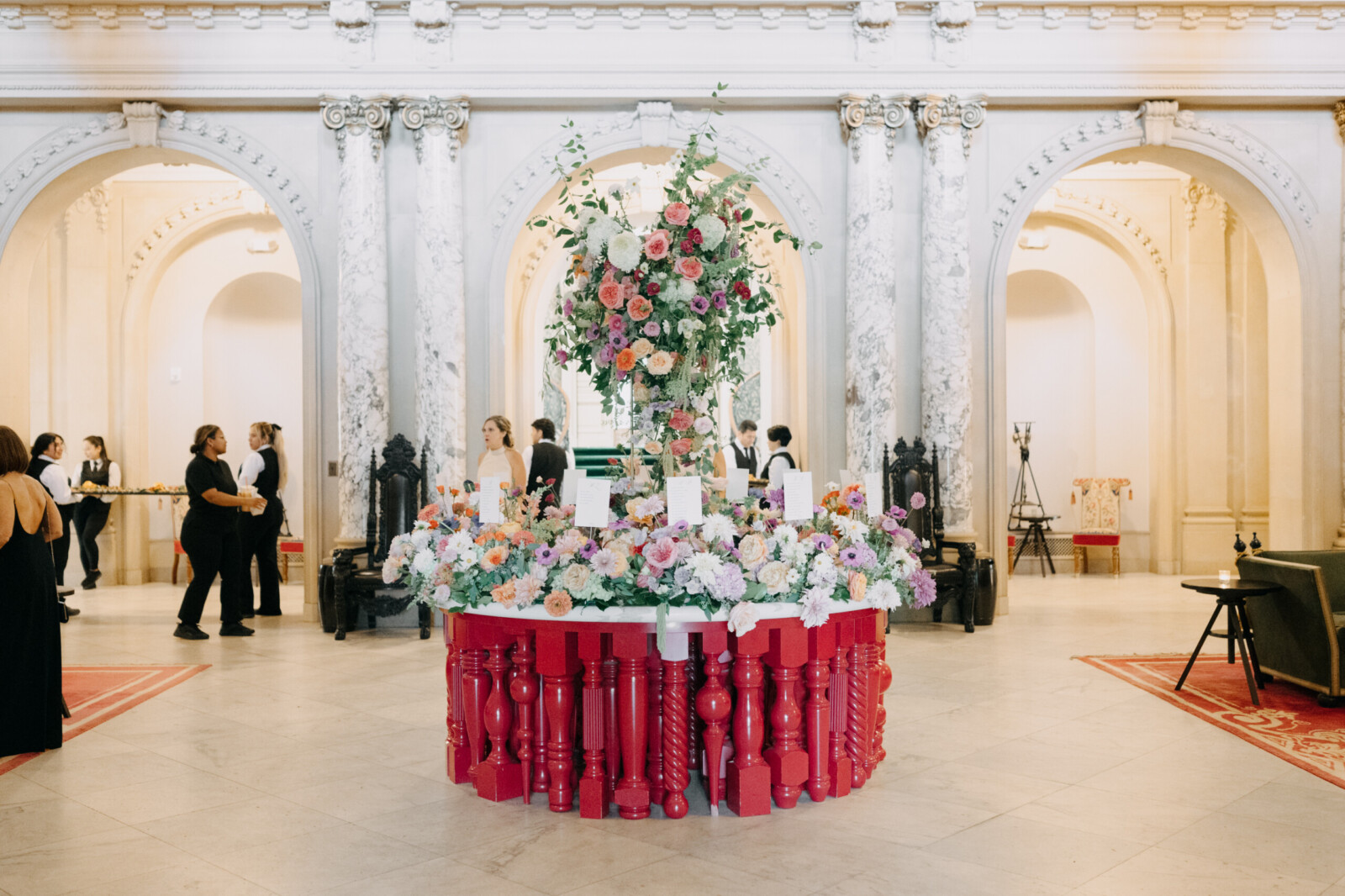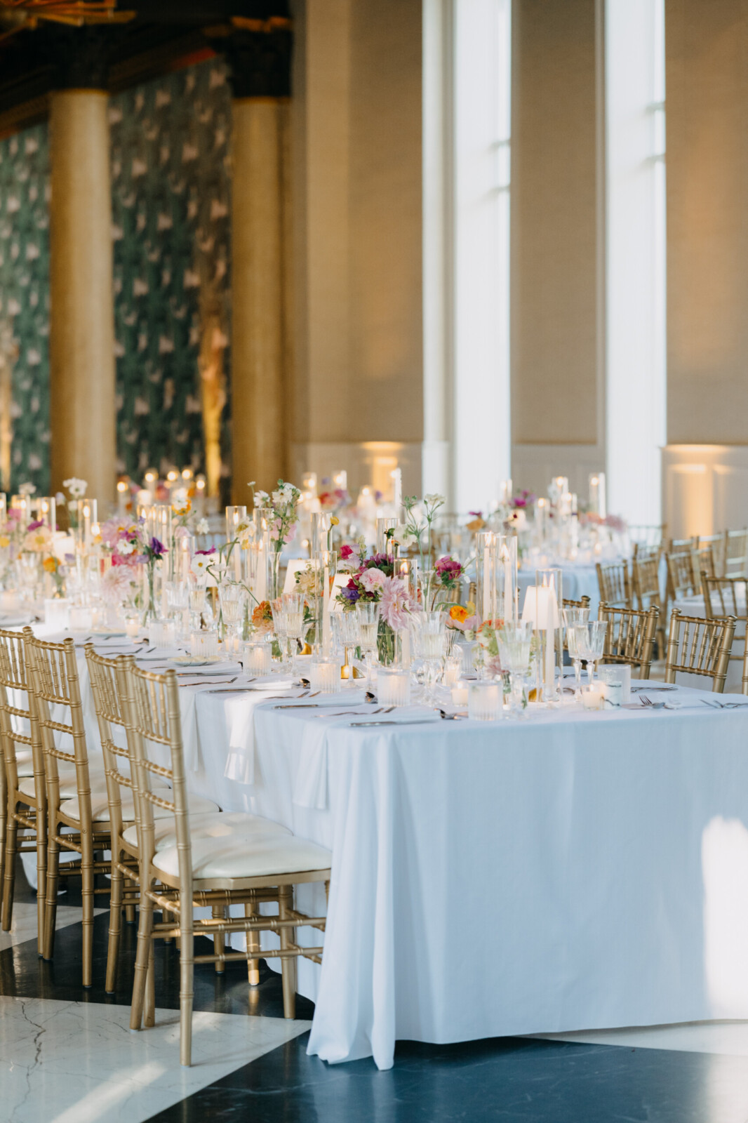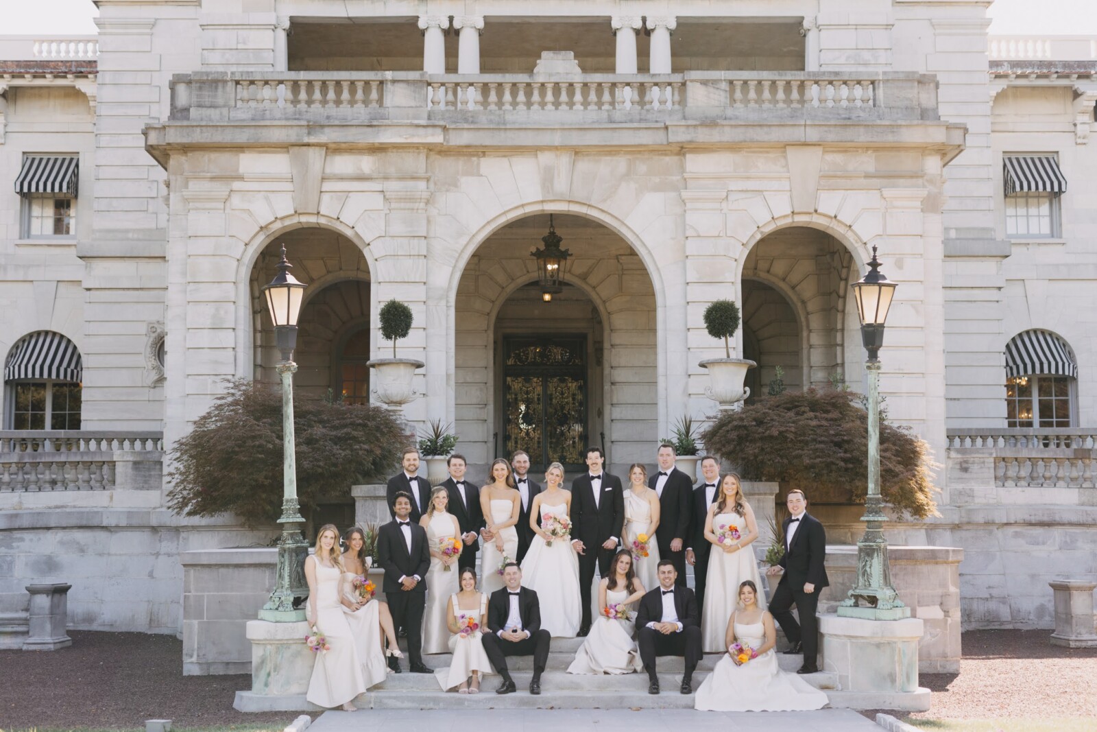 The couple had their hearts set on a modern chateau vibe, allowing the Gilded Age grandeur of their wedding venue, Elkins Estate, shine through. They also incorporated pops of whimsy and color throughout the floral designs and décor details.