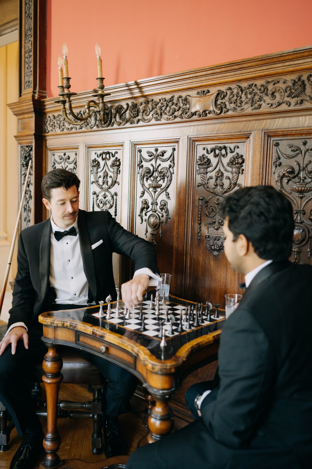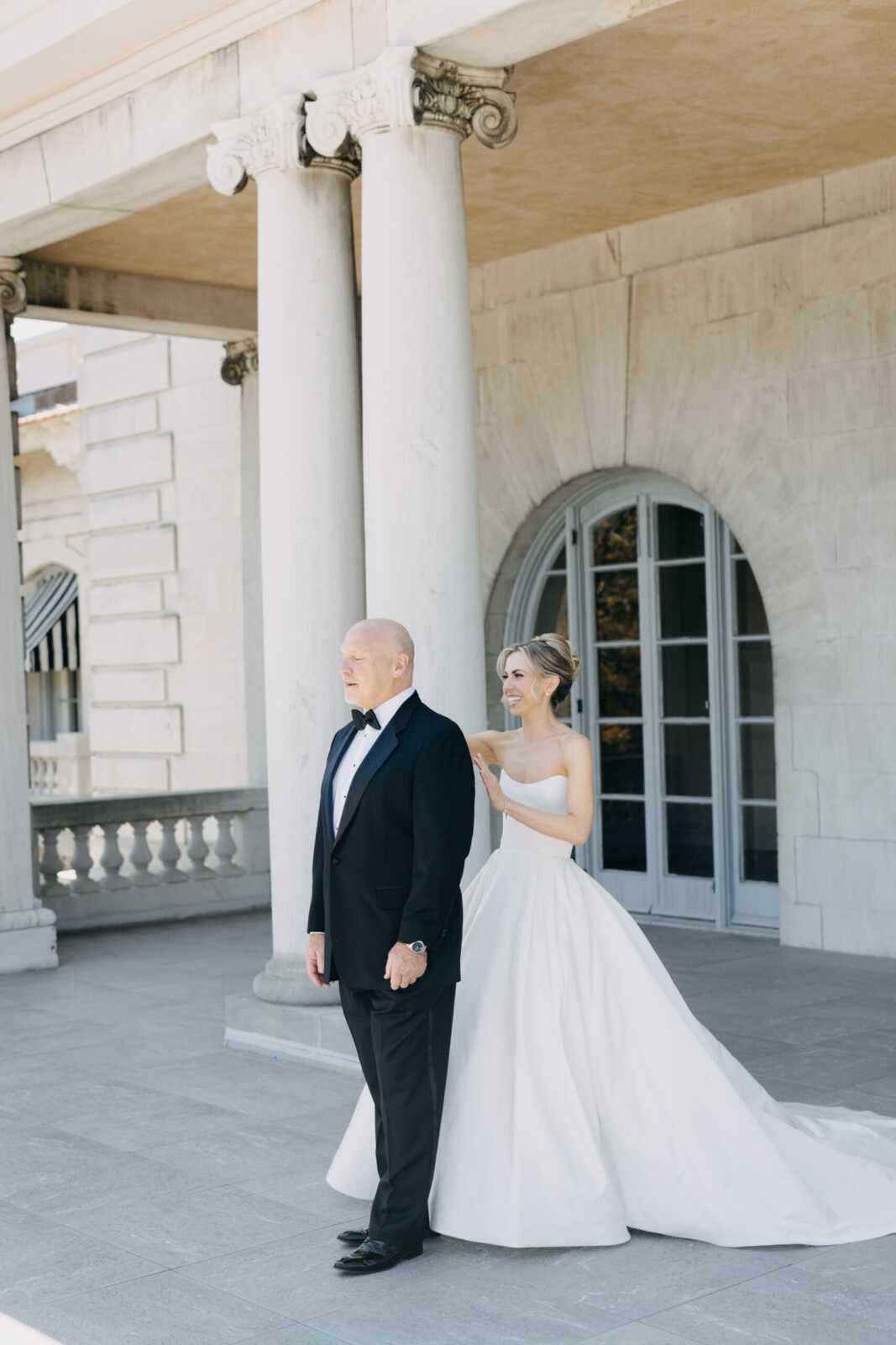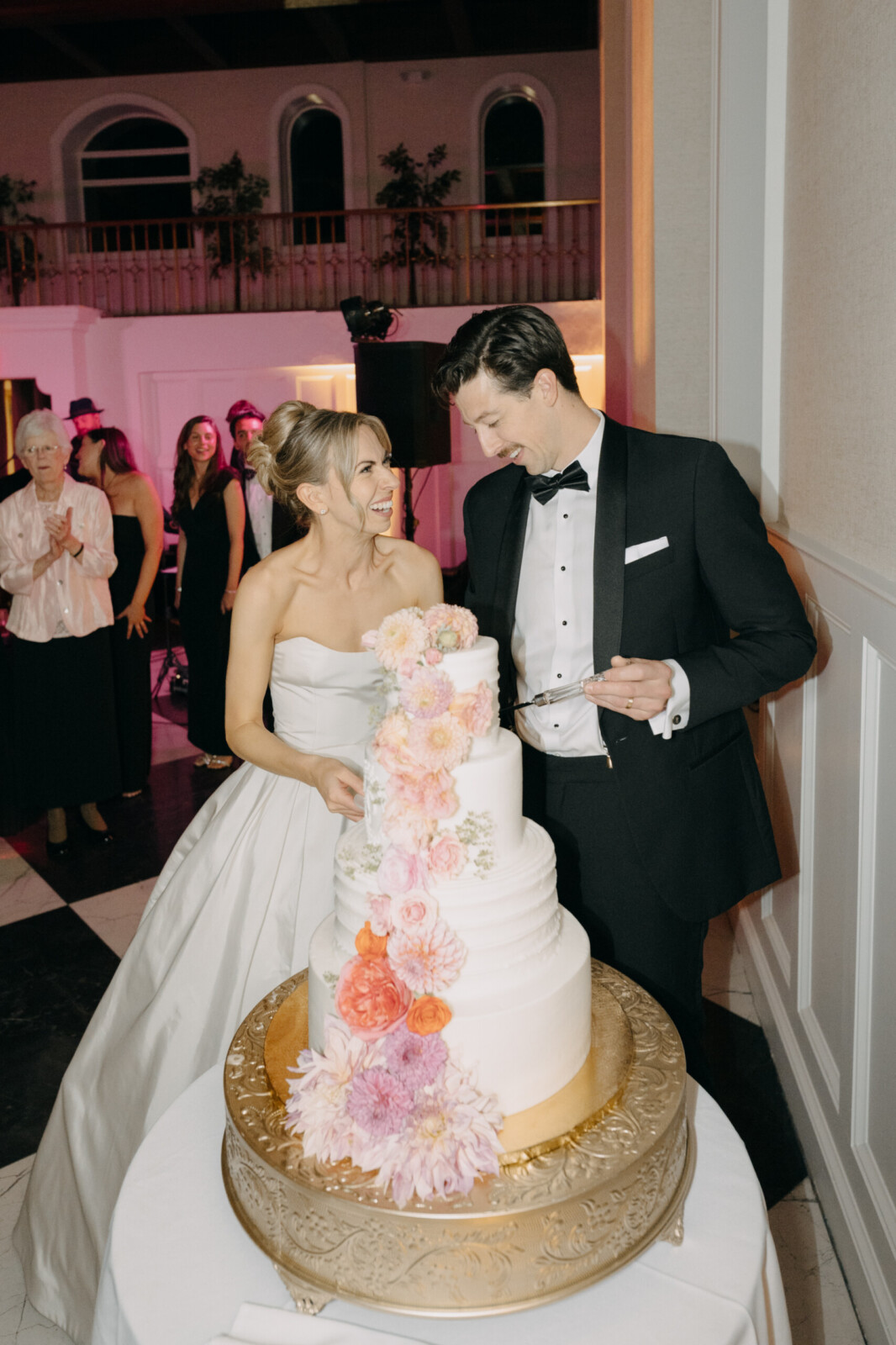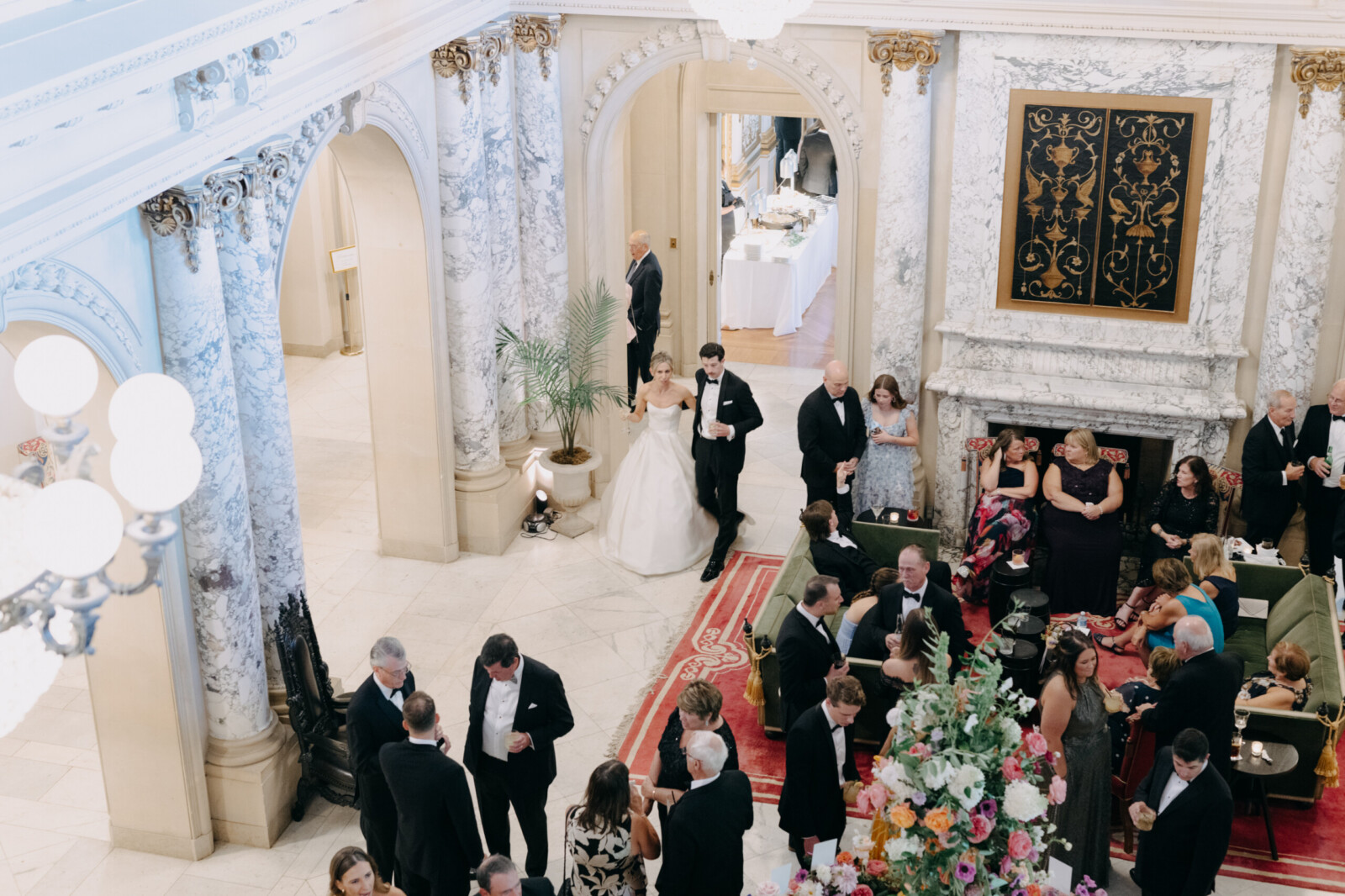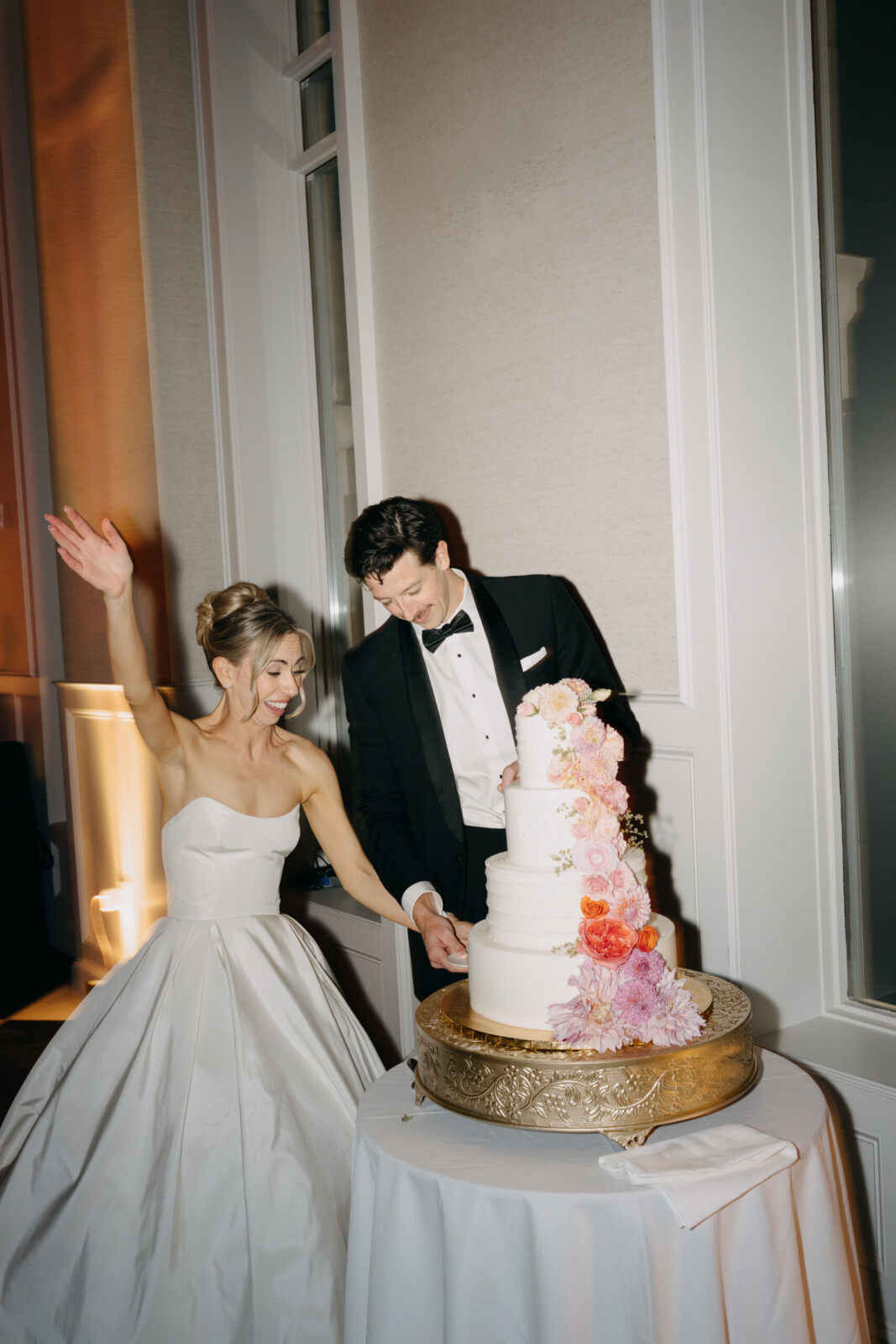 The couple had their hearts set on a modern chateau vibe, allowing the Gilded Age grandeur of their wedding venue, Elkins Estate, shine through. They also incorporated pops of whimsy and color throughout the floral designs and décor details.