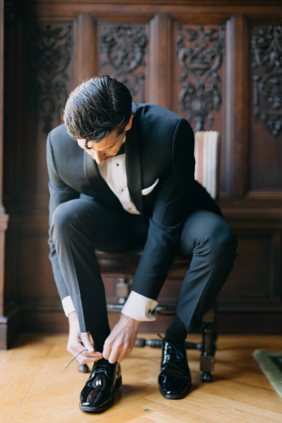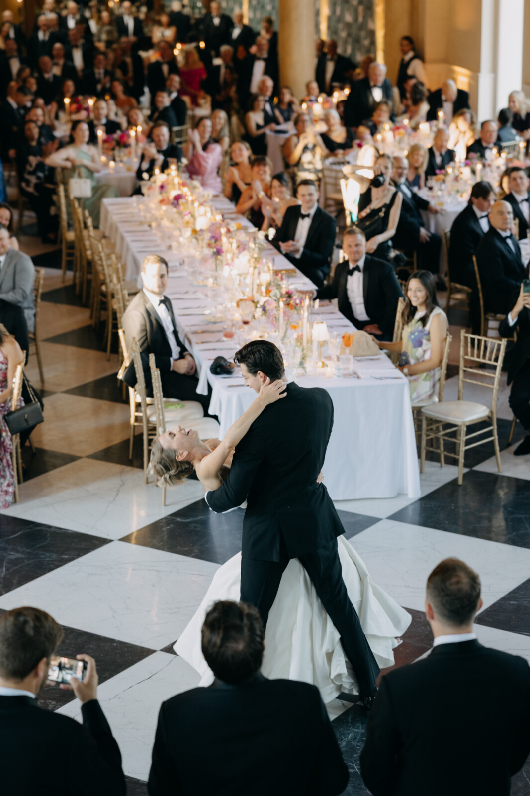 “Margaux St. Ledger, our florist, is AN ARTIST,” Kelly emphasizes. “She was fun to work with and brought this crazy vision we had for a huge floral centerpiece/seating chart to life so flawlessly. It was a standout element of the day, waiting for all the guests as they made their way inside the Great Hall. The library was one of our favorite rooms. We were able to decorate the bookshelves with photos of loved ones who had passed, plus some quotes from our favorite music and poems (music was something we bonded over from the very start). In the reception space, we were thrilled to be surrounded by our wedding party at a King's Table—decorated with whimsical, colorful florals, lamps, and candles. It was an absolute dream.”