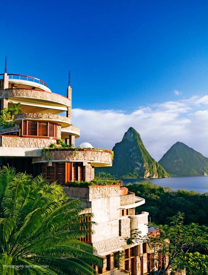 Rising majestically above the 600 acre beach front resort of Anse Chastanet, Jade Mountain St. Lucia is a cornucopia of organic architecture celebrating St Lucia’s stunning scenic beauty.